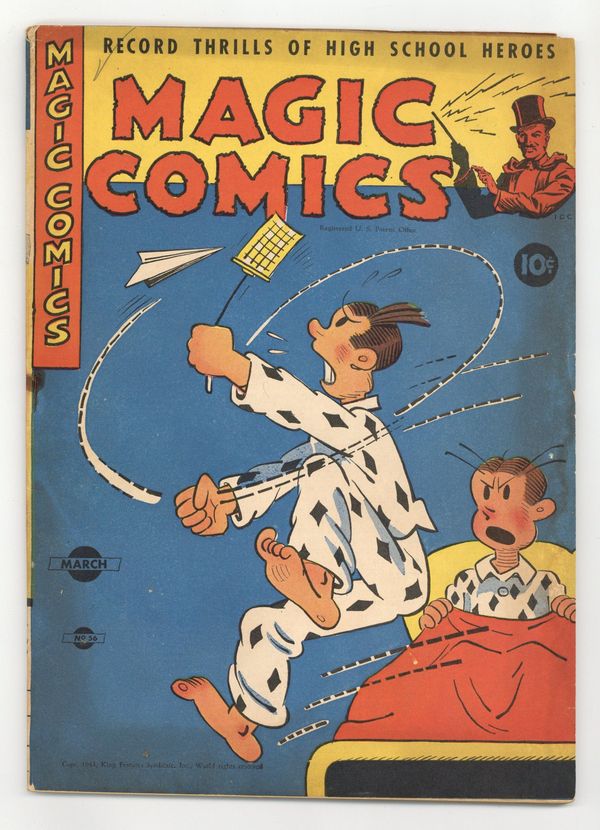 Edited by Margery McKay (sometimes credited as G. Whiz). Stories and art by Lee Falk, Phil Davis, Feg Murray, Clayton Knight, H. H. Knerr, Fran Striker, Charles Flanders, Floyd Torbert, Robert Storm, Mel Graff, Carl Anderson, Edwina Dumm, Chic Young, Bob Dunn, Frank Miller, Joe Musial, Billy DeBeck, Jimmy Thompson, Eugene L. Pollack, Tom Sims, and Bela Zaboly. Lee Falk's adventurer Mandrake the Magician gets top billing in this anthology series featuring reprints of King Features Syndicate comic strips. Carl Anderson's Henry gets up to silent mischief. The back cover ad offers war bonds, victory gardens, and other WWII-era homefront drive items as prizes, as well as Gene Autry accessories and a mock Gatling gun. Mandrake the Magician; Seein' Stars; Jan and Aloysius; The Romance of Flying; Bunky; The Lone Ranger; Secret Agent X-9; Henry; Little Acorns; High Spots; Popeye; Barney Baxter; Blondie; Indian Lore; Tippie and Cap Stubbs; Dinglehoofer. 56 pages, Full Color. Cover price $0.10.
