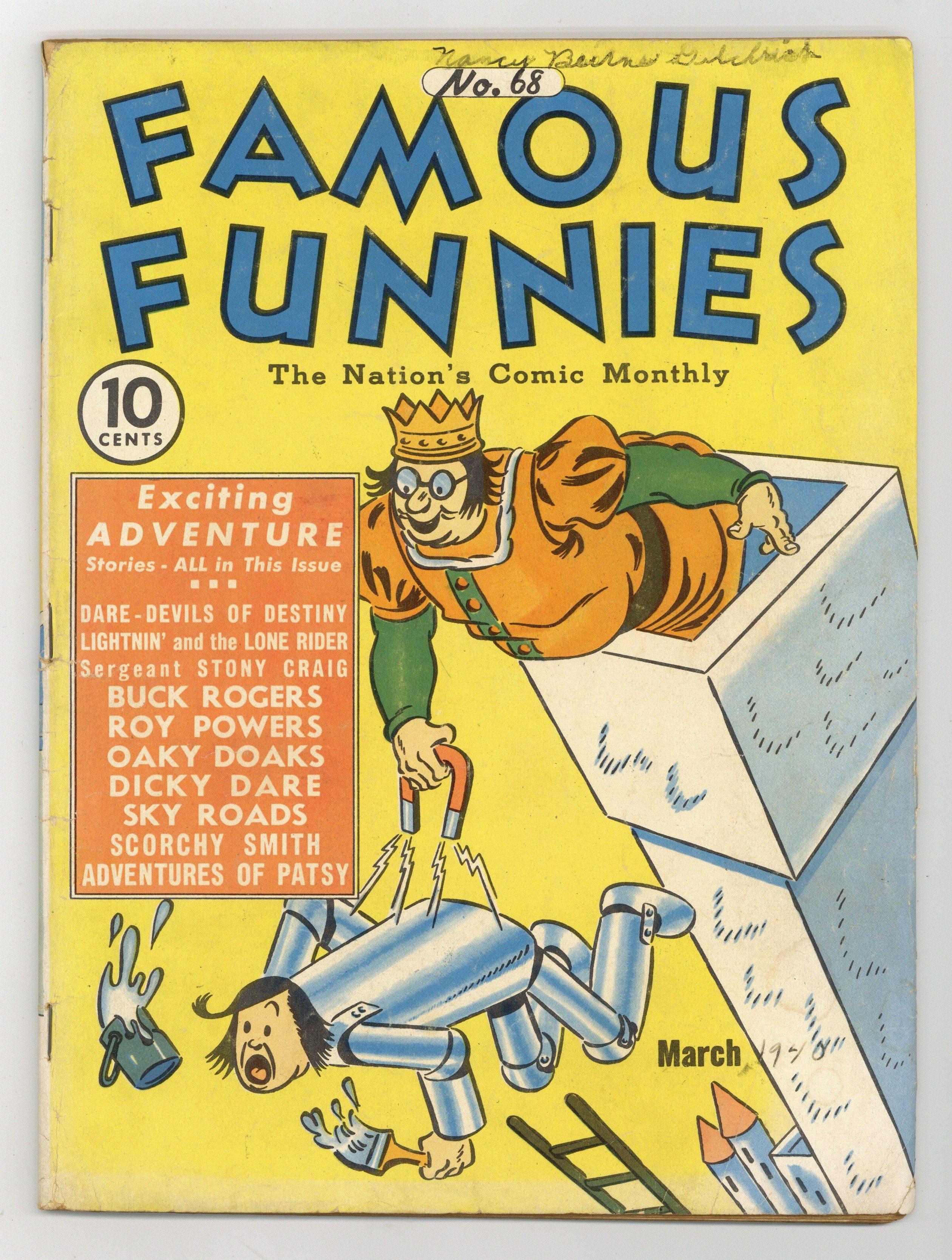 Victor E. Pazmiño cover. Contains comic strip reprints, activity pages, and a text story. In order of appearance: "Napoleon" by Clifford McBride; "Goofie Gags" by Victor E. Pazmiño; "The Gay Thirties" by Hank Barrow; "Roy Powers, Eagle Scout" by Paul Powell; "Buck Rogers" by Philip Francis Nowlan and Rick Yager (as Dick Calkins); "High Lights of History" by J. Carroll Mansfield; "Skyroads" by Dick Calkins and Russell Keaton; "Hairbreadth Harry" and "High-Gear Homer" by F. O. Alexander; "Jitter" by Arthur B. Poinier; "Sergeant Stoney Craig" by Frank Rentfrow and Don Dickson; "Big Chief Wahoo" by Allen Saunders and Elmer Woggon; "Dickie Dare" by Milton Caniff; "Adventures of Patsy" by Mel Graff; "Daredevils of Destiny" by Frank Rentfrow and Don Dickson; "The Frog Pond Ferry" by M. E. Brady; "Oaky Doaks" by Ralph Briggs Fuller; "Seaweed Sam" by Victor E. Pazmiño; "Olly of the Movies" by Julian Ollendorff; "Scorchy Smith" by Noel Sickles; "Somebody's Stenog" and "The Back-Seat Driver" by A. E. Hayward; "Lightnin' and the Lone Rider" by Jack Kirby (as Lance Kirby) and Frank Robbins; "Above the Crowd" by Benjamin D. Allen (as Stookie Allen); "Babe Bunting" by Roy L. Williams; "Mescal Ike" by S. L. Huntley and Art Huhta; "Connie" and "The Wet Blanket" by Frank Godwin; "Life's Like That" by Fred Neher; "Queenie" by S. M. Iger (as Bob Bliss); "Homer Hoopee" by Fred Locher; and "Spunky Dory" by M. E. Brady. "Steve takes a Chance" text story by F. S. Saunders. Activity pages by A. W. Nugent. 68 pages. Full color. Cover price $0.10.