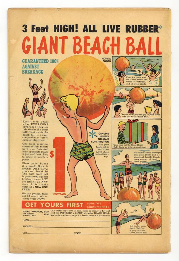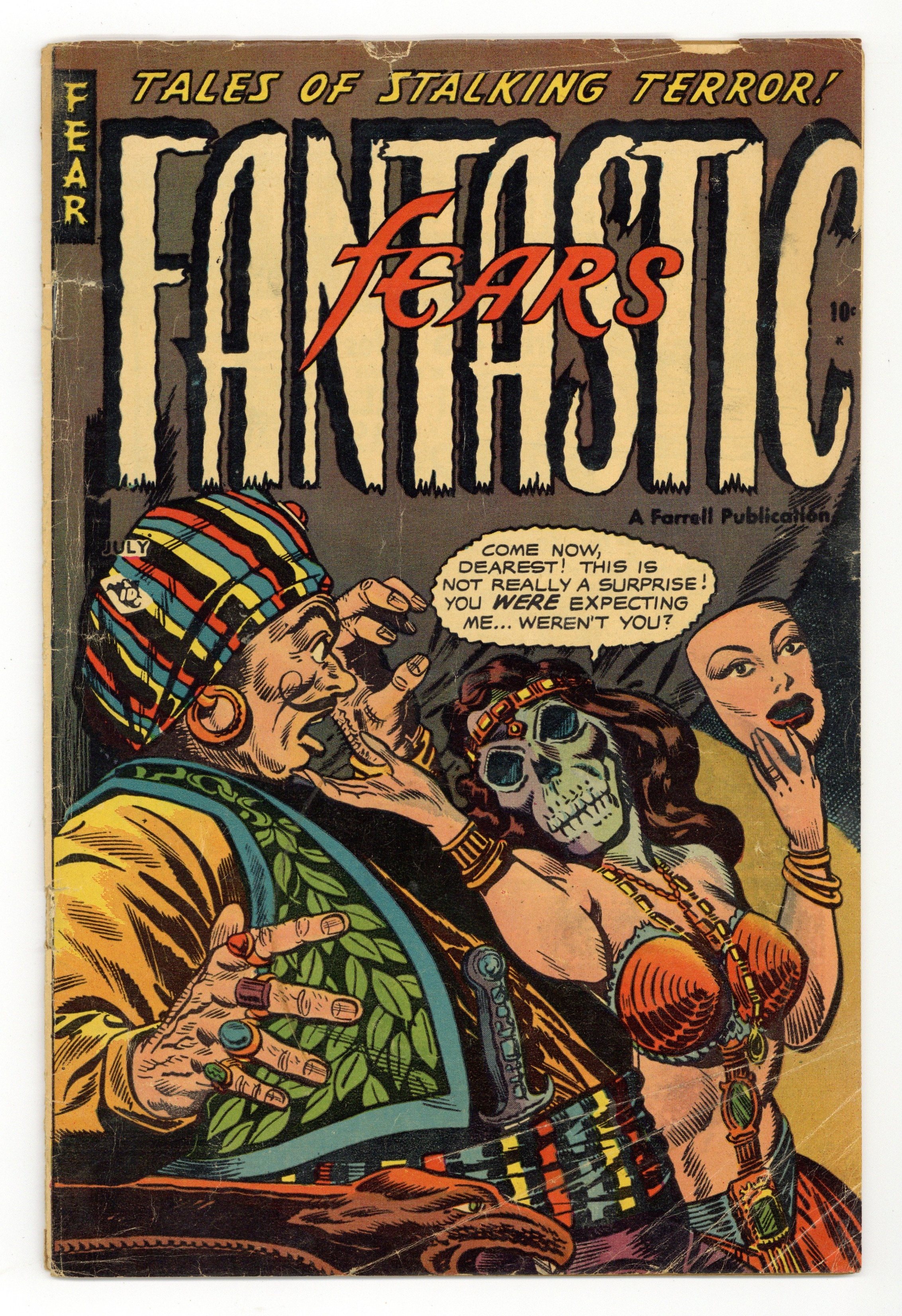 "Fiends from the Crypt"; Chasing a thief named Banco into the Rome sewers, Signor Renzi and his partner, Pietro find Banco with all his body eaten; They try to escape the sewer, and find themselves hunted by the Green Horde. "Little Red Riding Hood and the Big Bad Werewolf"; The Old Crone, saying she's the real grandmother of Little Red Riding Hood, tells the true story; Elmer Dowd turns into a werewolf; As a werewolf, he attacks Red Riding Hood. "Careless Corpse"; Dave Tibbets leaves his wife Becky so he can go to work; He crashes his car and dies; Not realizing he looks like death warmed over, he encounters a lot of people who do realize he looks that way as he heads for home. "Carnival of Terror"; Chun, the Snake Charmer, who charms cobras with his flute, stays with the carnival he despises only to stay near Millie Sears; He reveals his attraction to Millie, who laughs; Joe has Millie tell Chun she'd go with him, and he shows her where his money's hidden; Chun shows her the money, which is kept protected in the cobra cage; Joe and Millie go to steal the money. 36 pgs., full color. Cover price $0.10.