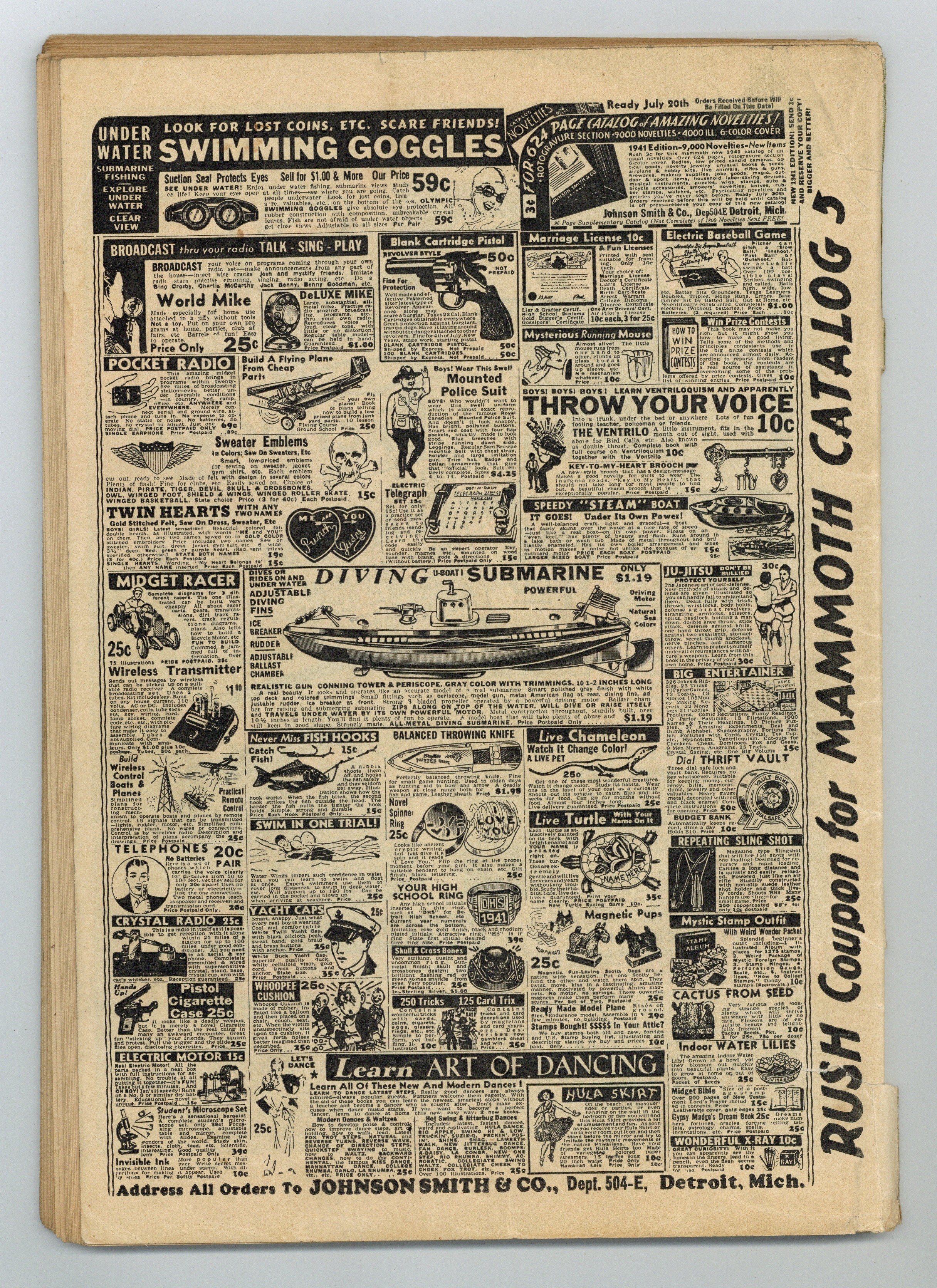 Published Oct 1940 by Centaur Comics.$700.00- 4" Cumulative spine split. Cover and centerfold detached.