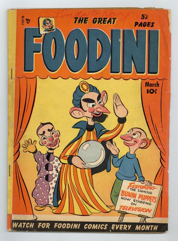 Published Mar 1950 by Continental.$27.50Based on a popular kids' puppet show broadcast on CBS from 1948-51 about a sinister but bumbling magician and his loyal but good-hearted assistant, Pinhead. Pinhead and Foodini risk their lives to foil a nefarious plot. Foodini demonstrates how to do magic tricks. The adventures of Jingle Dingle the weather elf, another popular icon from the early days of television. The Great Foodini; Foodini's Deed For the Day; Pinhead Takes Over; Jingle Dingle; Foodini's Fortune; Foodini's Guest Appearance; Foodini's Last Mile; Foodini's Circus Mystery; Foodini's Ghost of a Chance. 48 pages, Full Color. Cover price $0.10.