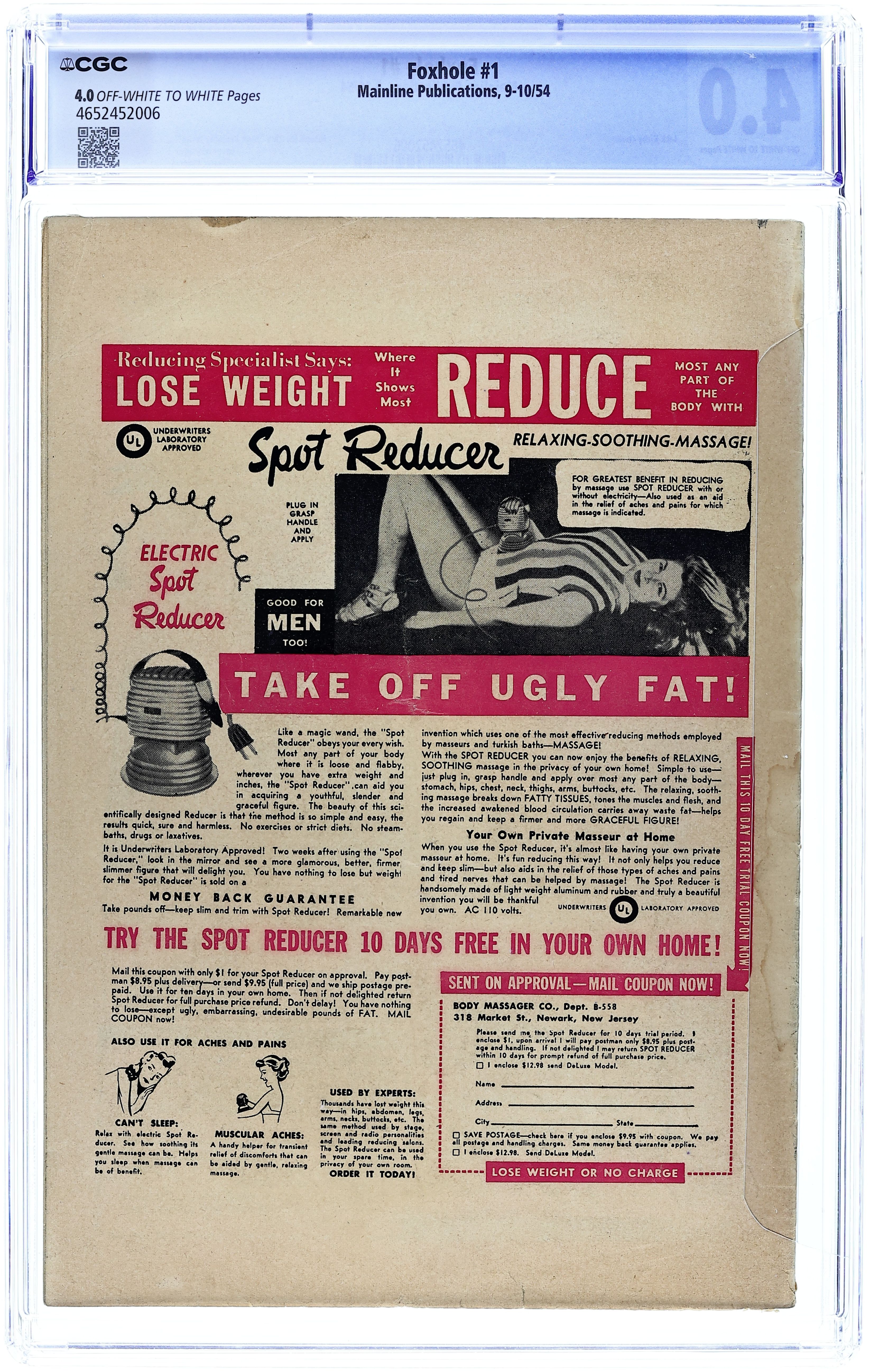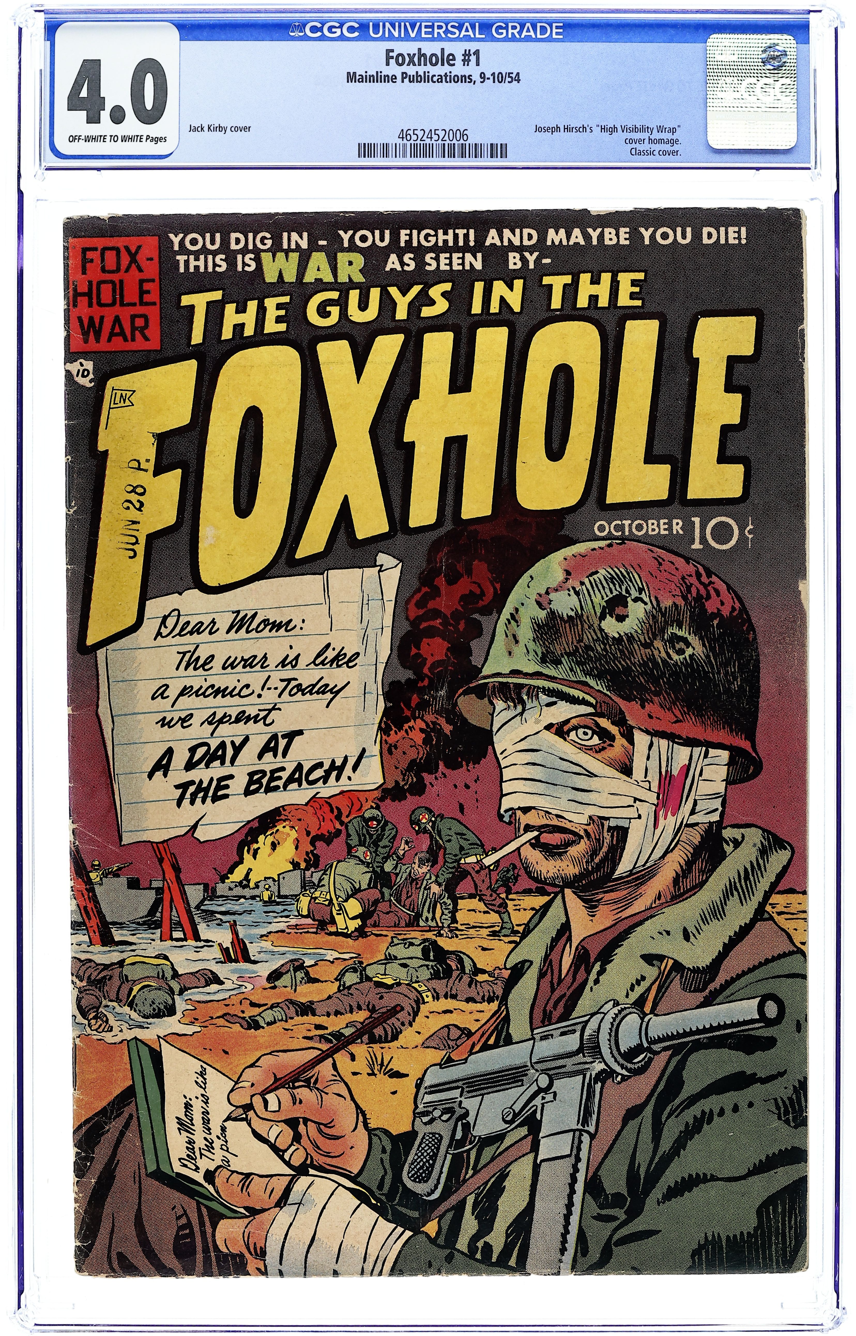 Cover by Jack Kirby. Stories and art by Jo Albistur, Bill Walton, John Prentice, and Bill Draut. Gritty war comics "produced by veterans" (as the tagline proclaims) from Mainline, the publisher founded by comics legends Joe Simon and Jack Kirby, creators of Captain America. An American soldier captured during the Korean War is subjected to brainwashing techniques by the enemy. A soldier writes a letter home to his mother, but the visuals in the story provide a stark counterpoint to his reassuring lies about a trip to the beach. American soldiers stationed in Britain woo two beautiful women during the London Blitz. Cover by Jack Kirby is based on a painting by acclaimed artist Joseph Hirsch. Brain Wash; Casualty; A Day at the Beach; Fox-Hole Joe; Operation Foul-Up; Eight Ball Hero; Fruit Salad. 36 pages, full color. Cover price $0.10.