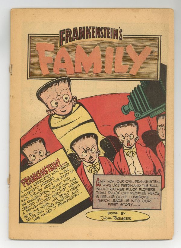 Stories and art by Dick Briefer and Bruce Elliott. Cover by Dick Briefer. The first incarnation of Dick Briefer's famed Frankenstein comic featured Addams Family-style dark comedy and monster hijinks. Frankenstein's Monster gets a job and decides he wants to support a family; The Monster is confused when mutated convicts invade a small town; The Monster joins Professor Gonif in his time machine. Frankensteins Family; The Monsters; Nothin' Ever Happens; The Mummies; The Time Machine. 52 pages, Full Color. Cover price $0.10.