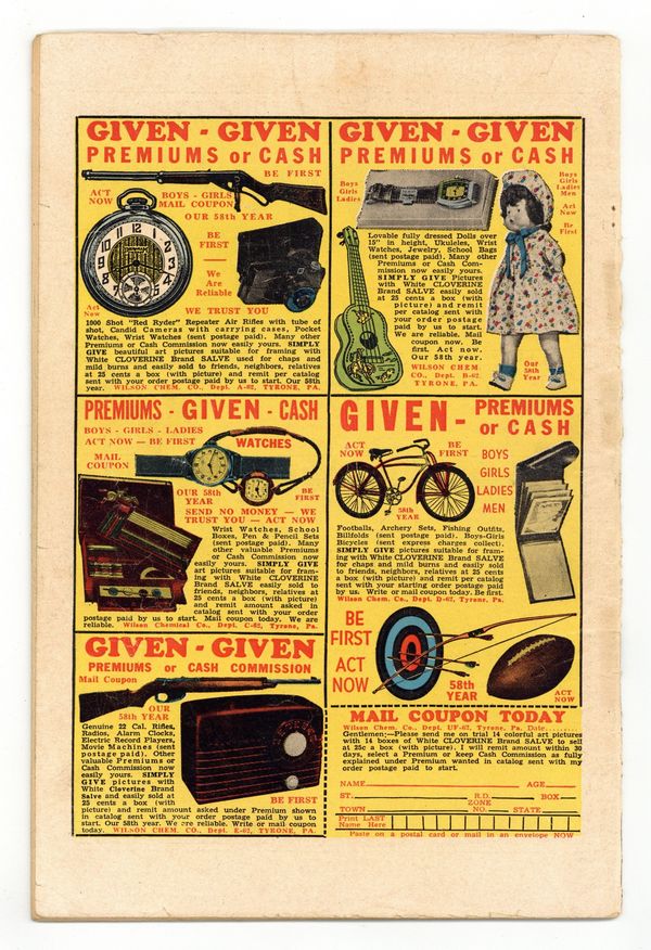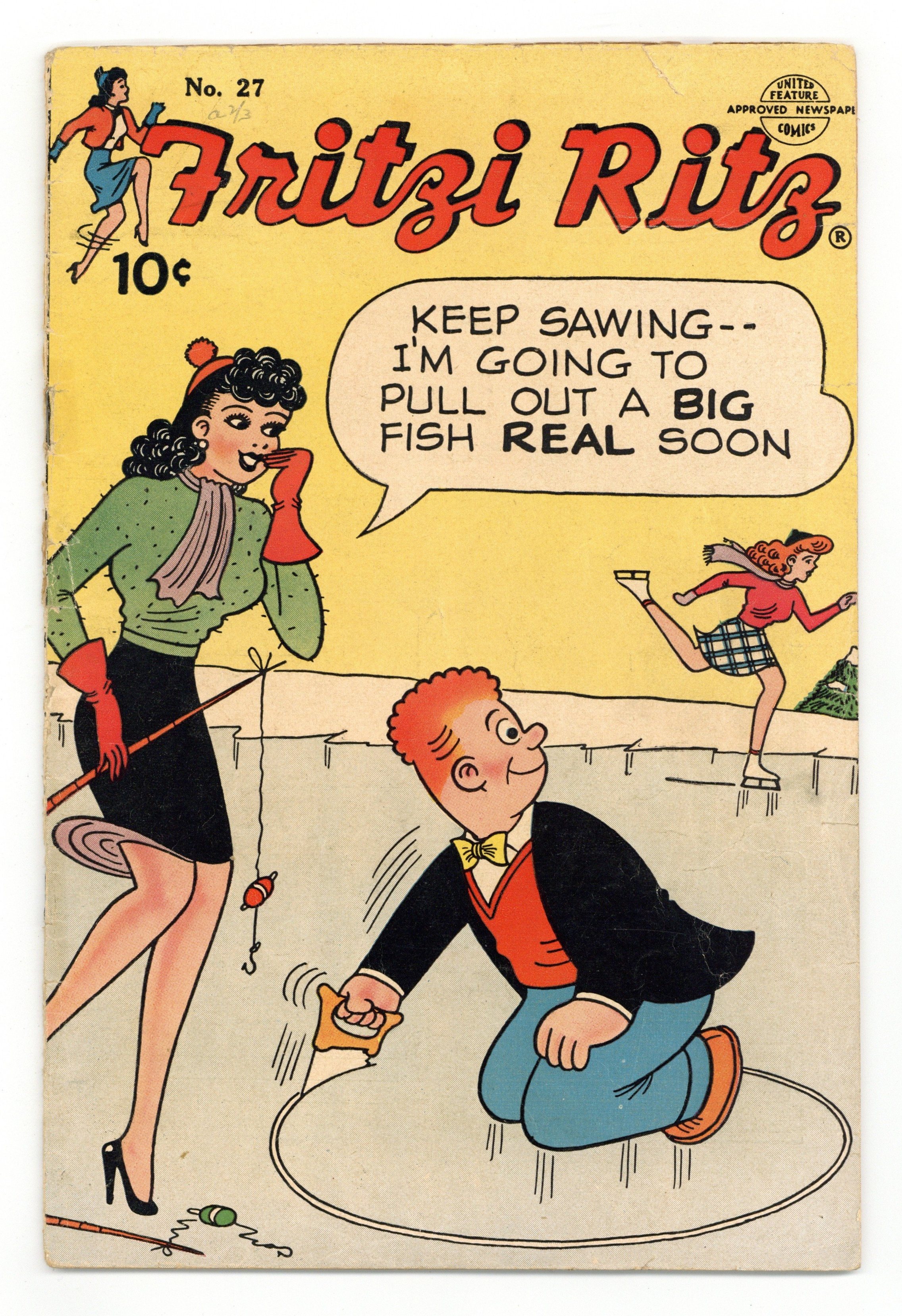 Cover by Ernie Bushmiller. Stories and art by Ernie Bushmiller, Charles Schulz, Russell Patterson, Elizabeth Woodward, and Raeburn van Buren. NOTE: For issues #8-26 see United Comics (1940/1950). The comic-strip adventures of aspiring model Fritzi Ritz and her boyfriend, the bumbling Phil Fumble. Fritzi was later known as "Aunt Fritzi" in the Nancy comic strip. Phil's housecleaning efforts are compromised by a 1950s habit of watching TV in the dark. Phil and Fritzi have misadventures while trying to ski down a mountain in deep snow. Phil bets Fritzi that he can survive in the wilderness for a week without food or supplies. One of the backup strips is Charles Schulz's Peanuts, then only in its fourth year; several daily strips are presented in full color. (In one strip, Charlie Brown appears to have "hair.") Fritzi Ritz; Peanuts; Abbie an' Slats; Stamp Tips; Mamie. 32 pages, Full Color. Cover price $0.10.