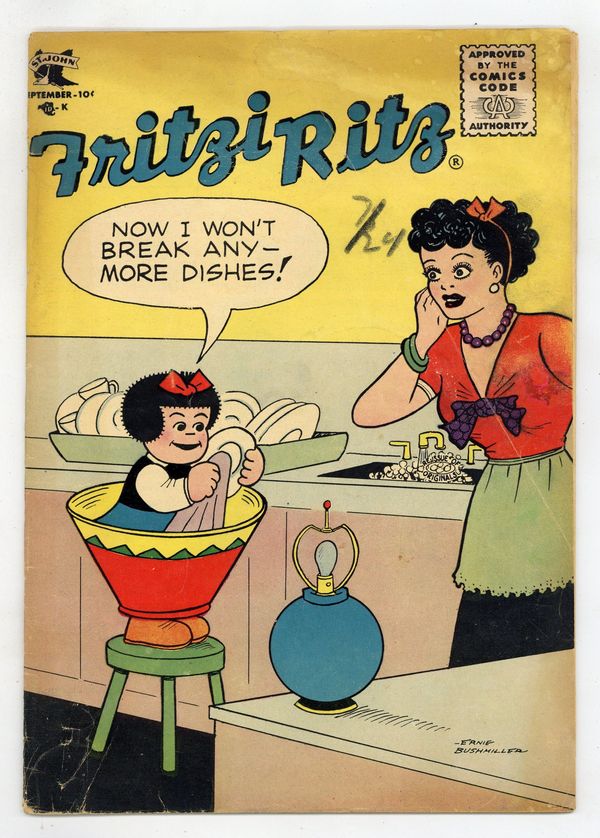 Cover by Ernie Bushmiller. Stories and art by Ernie Bushmiller, Charles Schulz, Ernest G. Osborne, and Leonard Sansone. The comic-strip adventures of aspiring model Fritzi Ritz, her boyfriend Phil Fumble, and her precocious niece Nancy. Phil takes in the bathing beauties at the beach, in a strip that showcases Bushmiller's "good girl" art. Fritzi wants to go to a "modern" restaurant, in a strip that likewise showcases Bushmiller's design talent. Fritzi's new perfume leaves something to be desired. Plus early Peanuts strips by Charles Schulz, and the Dennis the Menace-like Willie. The Family Scrapbook; Fritzi Ritz; Willie; Peanuts; Nancy. 32 pages, Full Color. Cover price $0.10.