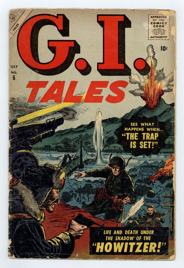 $43.00Final issue of the series. "Howitzer!" (art by Gene Colan), "Strike at Zero Hour" (art by Joe Orlando), "Wall of Fire," "Wounded in Action" (art by George Woodbridge), and "The Trap is Set!" (art by Bob Powell), plus a two-page text story, "War in the Swamp." Cover price $0.10.