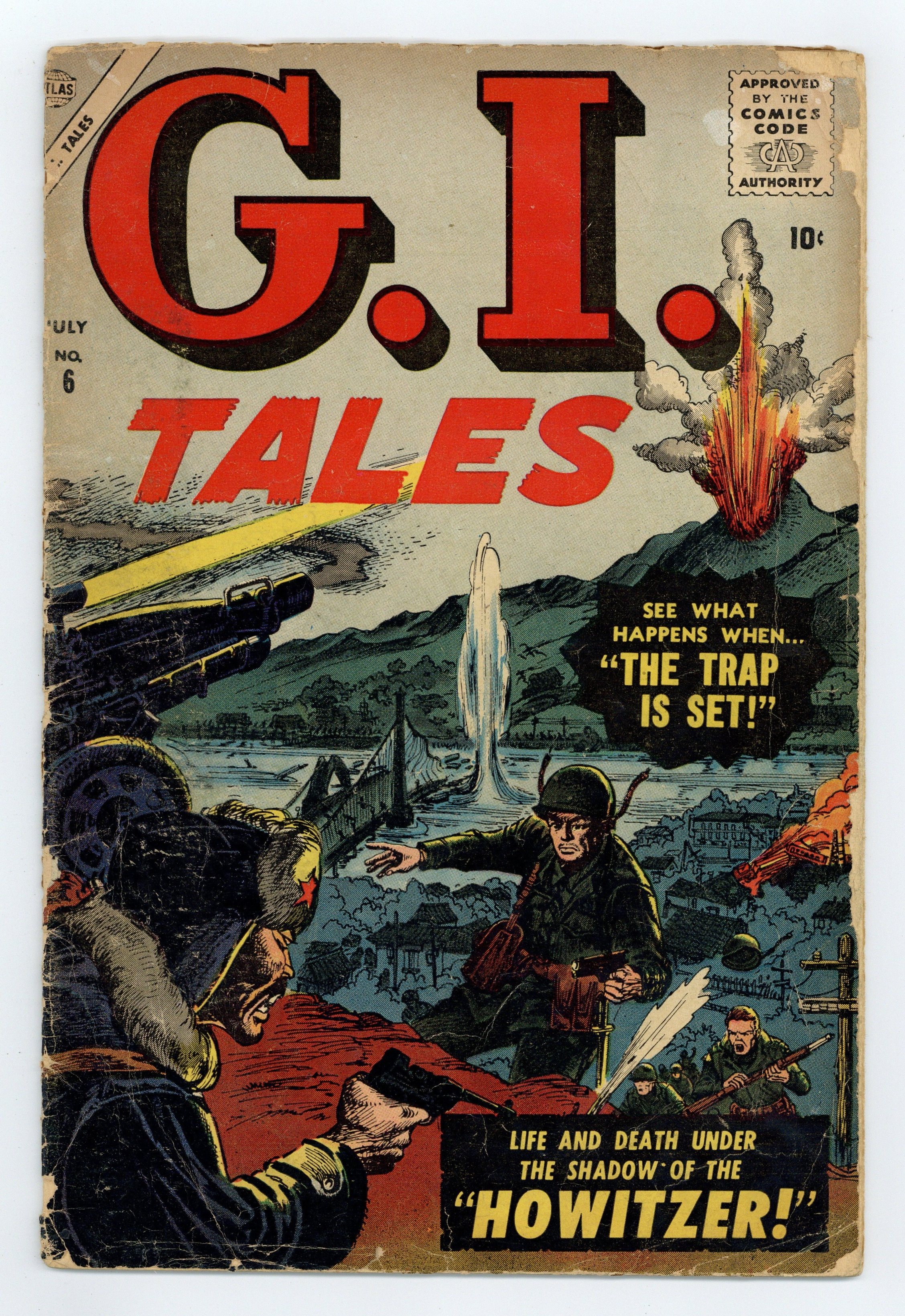 Final issue of the series. "Howitzer!" (art by Gene Colan), "Strike at Zero Hour" (art by Joe Orlando), "Wall of Fire," "Wounded in Action" (art by George Woodbridge), and "The Trap is Set!" (art by Bob Powell), plus a two-page text story, "War in the Swamp." Cover price $0.10.