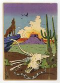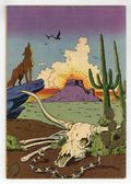 Published Dec 1951 by Ziff Davis.$68.00Cover by Clarence Doore. Stories and art by Dan Barry, Murphy Anderson, George Tuska, Ed Silverman and Alex Kotzky. Tough marshal Bob Hardie is better known to friend and foe alike as The Hawk. The lawless town of Adobe Bend must change after Marshal Bob "Hawk" Hardie rides into town, but outlaw Slash hires Lobo Moreno to get rid of The Hawk. Marshal Hardie arrives in Armadillo Flats and goes after Reb Sutton and his band of killers. Pajaro, new chieftain of the Mescaleros, declares war on white settlers, but his blood brother Sangre tries to convince him otherwise, in a story with art by comics legend Murphy Anderson. Plus the lyrics to the Western tune "Billy Venero" and a comics biography of Walter Scott, the man known as "Death Valley Scotty." Nice painted cover by Clarence Doore. Death Valley Scotty; The Law of the Colt; Cowboy Songs of the Old West: Billy Venero; A Fair Exchange; Six-Gun Showdown; Ghost Towns of the Old West: Cripple Creek; Blood Brothers; The Great American Desert. 32 pages, Full Color. Cover price $0.10.