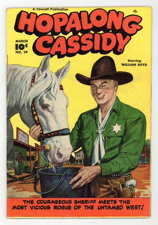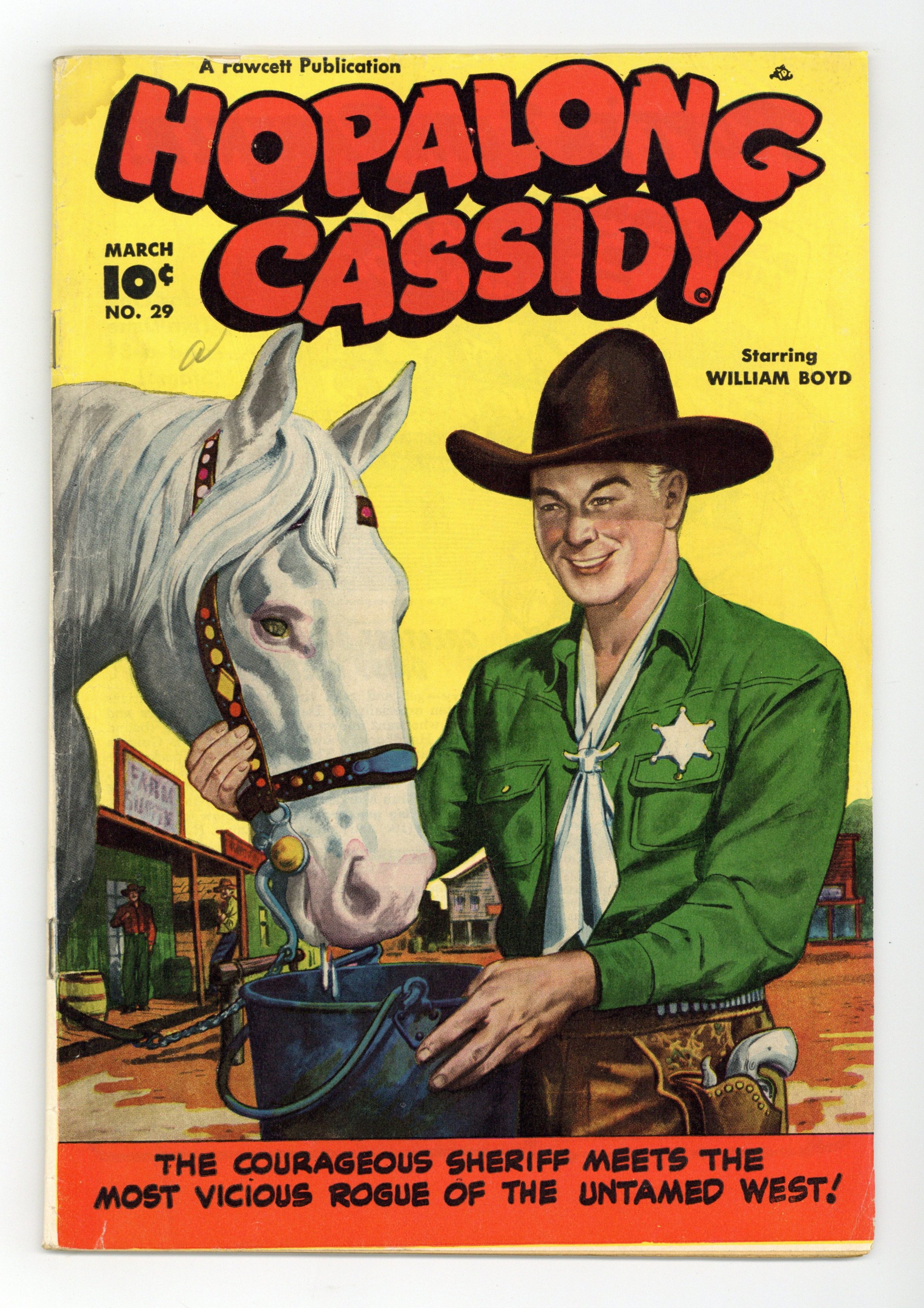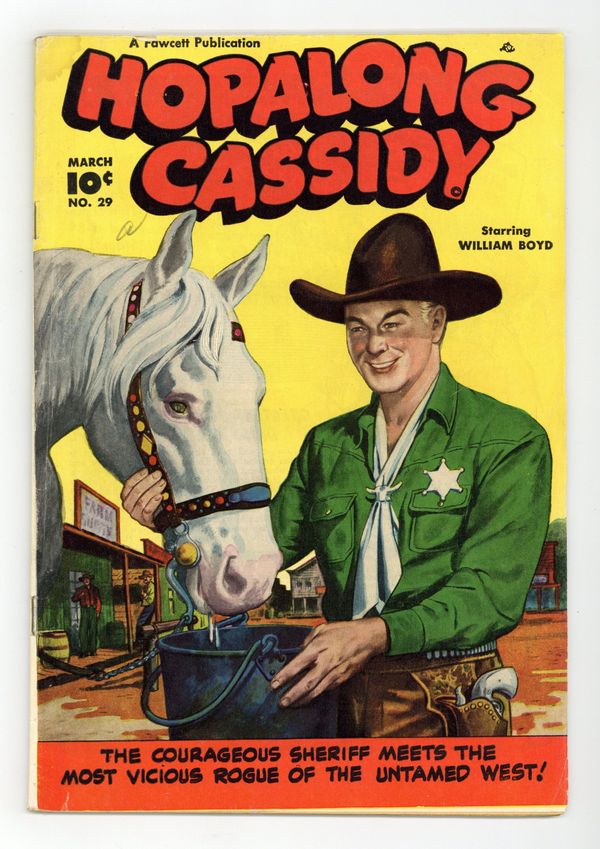 Stories and art by Rod Reed and Frank Bolle, plus "Comix Cards" by Mac Raboy. Western adventure featuring one of the most popular heroes of the mid-20th century, star of TV, film and radio. Hopalong matches wits and gunplay with the most feared outlaw of the West, Dangerous Dan McHugh. Pop Deville frames Hard Luck Joe for a saloon shooting, so that his son, the real killer, can help him pull a robbery. Pistol-Packin' Pattie makes short work of a cowpoke's self-admiration. Plus Comix Cards (like the later Marvel Value Stamps) featuring Captain Marvel Jr., with art by Mac Raboy. Dangerous Dan McHugh!; Hill Billy; Falsely Accused; Tightwad Tad; Nature's Boy; Be a Sharpshooter!; Ballyhoo Barney Stretches a Point; Whitey Whiskers and Daniel Boone, Jr.: The Angler with the Angles; Trail of Gold; Ridin' Herd with William Boyd; Pistol-Packin' Pattie; Hangman's Noose. 48 pages, Full Color. Cover price $0.10.