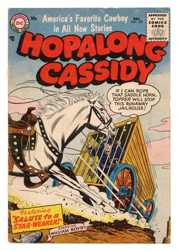 Cover by Gene Colan and Joe Giella. Stories and art by Gene Colan, Gardner Fox, John Broome, Martin Naydel, Ray Burnley, and Joe Giella. Western adventure featuring one of the most popular heroes of the mid-20th century, star of TV, film and radio. When the townspeople throw a party for Hopalong, outlaws set a trap, in one of three stories this issue illustrated by future Marvel legend Gene Colan. Hoppy investigates a murder with 20 possible suspects, in a story by legendary comics scribe Gardner Fox. Hoppy winds up trapped in a caged wagon. Plus fun facts from Old West history. Salute to a Star-Wearer!; Western Kwiz; The Case of the Twenty Suspects!; Strange Indian Beliefs; The Secret of the Guadalupes Gold!; Trail of the White Eagle. 32 pages, Full Color. Cover price $0.10.