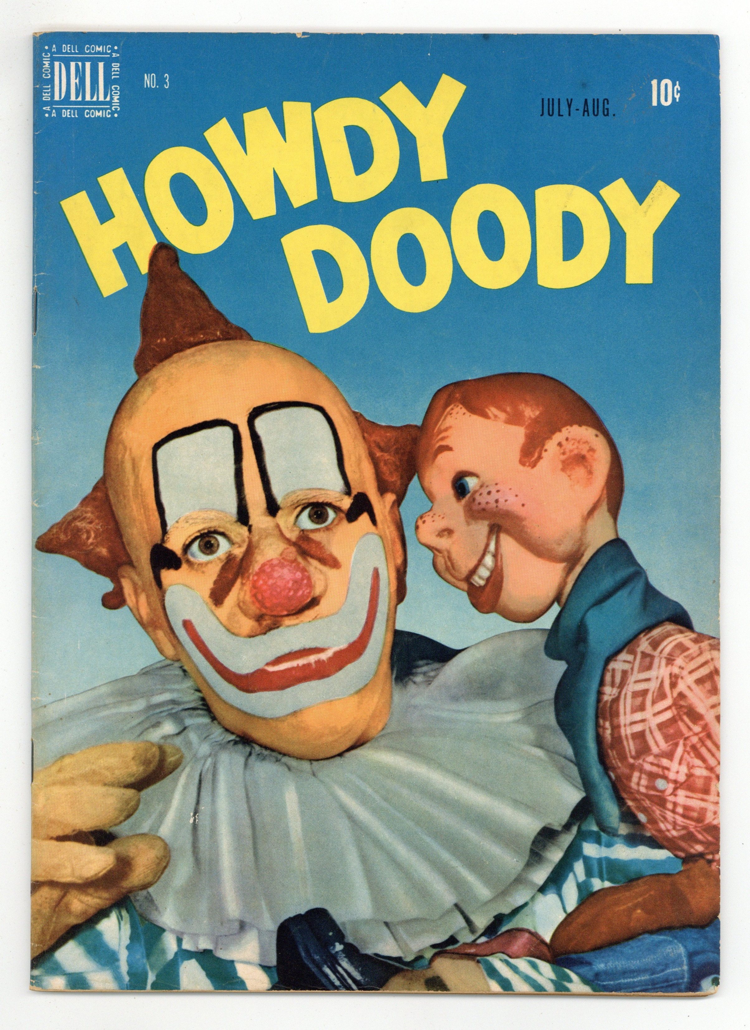 Photo cover features Bob Keeshan as Clarabell the Clown. An icon of 1950s Americana, Howdy Doody was a star of early television, and a mischievous Tom Sawyer-type adventurer in this comic. Howdy, Dilly and Phineas T. Bluster fall asleep in the museum and dream that they're back in the days when knighthood was in flower. Howdy and Dilly are mistaken for window washers and find themselves outside a high-rise department store. Flub-a-Dub accidentally gives George the Elephant a medicine-show tonic that's pure alcohol. Cover features Bob Keeshan, the future Captain Kangaroo, as the original Clarabell the Clown. Meet Howdy and Bob; Daze of the Knights; Howdy's Puzzle Page; Howdy Doody; Howdy Doody and the Air-o-Doodle; The Mysterious Trunk; Flub-a-Dub; Howdy's Gadgets. 48 pages, Full Color. Cover price $0.10.