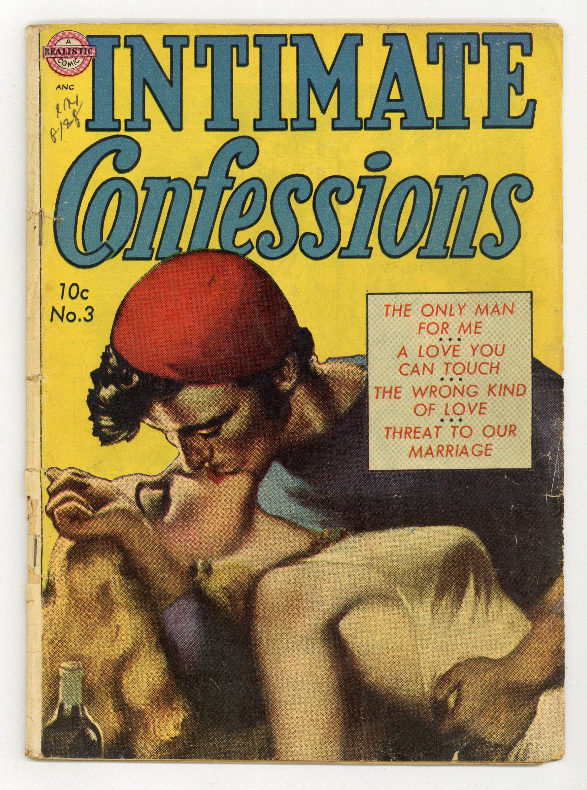 Art by Everett Raymond Kinstler, John Rosenberger, and Howard Larsen. Tales of romance with lush, lurid covers reprinted from Avon paperbacks and a title that suggests more than the stories themselves. A secret from the past threatens a married couples present happiness; A woman longs for the one man she cant have. Featuring a painted cover reprinted from Avon paperback #250. Also featuring a nice contents page illustrated by Everett Raymond Kinstler on the inside front cover. A Love You Can Touch; The Wrong Kind of Love; Threat to Our Marriage; The Only Man for Me. 32 pages, Full Color. Cover price $0.10.