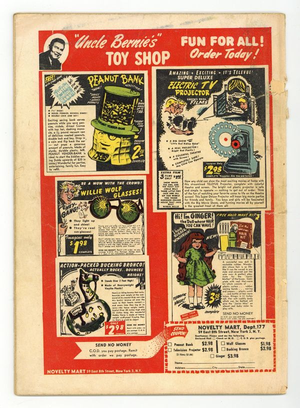Published 1951 by Magazine Enterprises.$64.00- 4" Cumulative spine split. Cover detached at one staple. Centerfold detached at one staple. Water damage.