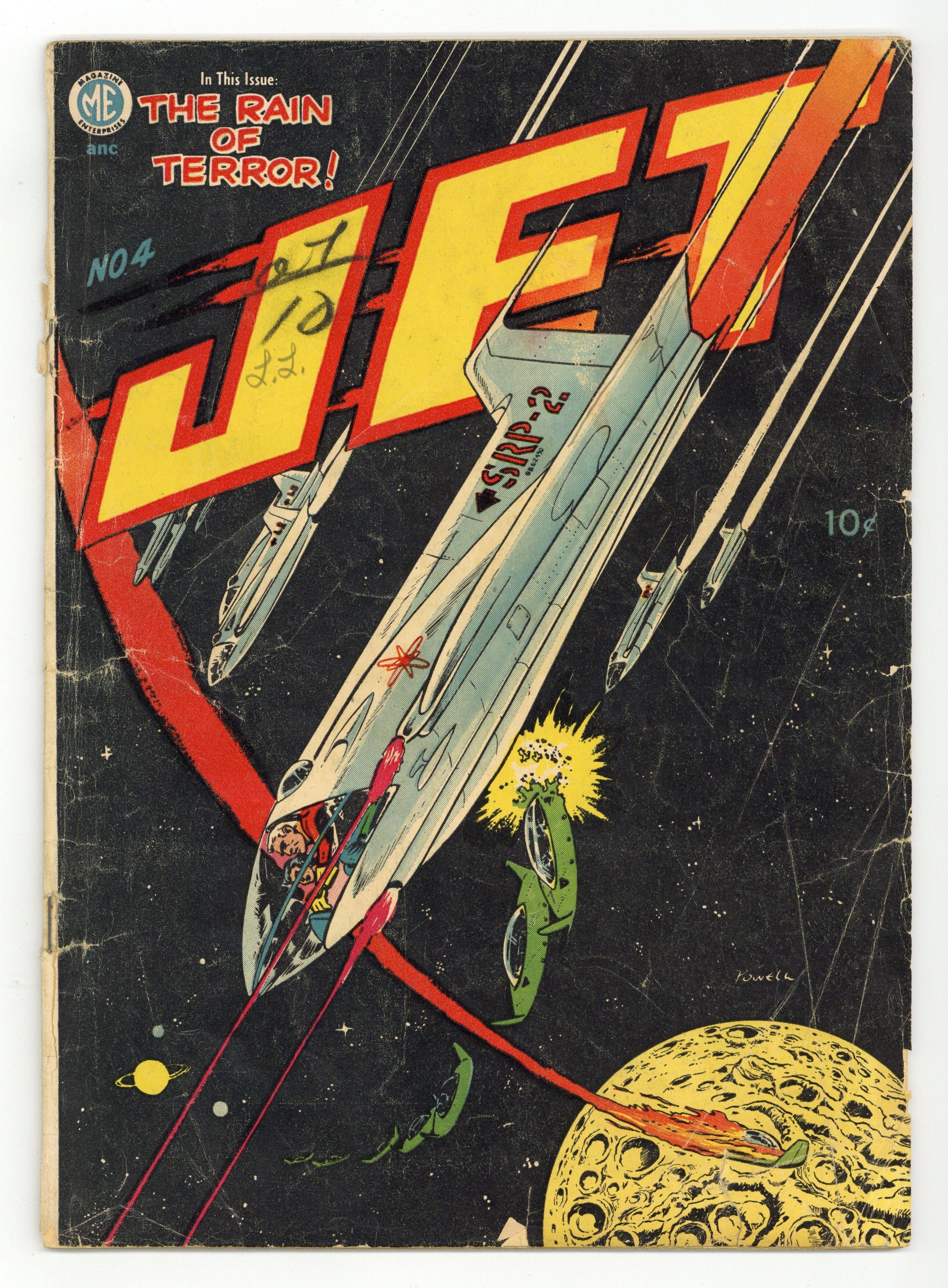Art by Bob Powell, Wally Wood and Al Williamson. Cover by Bob Powell. Sometimes listed as A1 Comics (1944 Life's Romances) #39. Science hero Jet Powers uses advanced tech to battle supervillains, in sci-fi stories that have gained a cult following for their Bob Powell art. In the aftermath of the Dust Doom from issue #3, humankind is prey to greedy opportunists and their napalm attacks; A pilot shot down over Korea discovers that he cannot be killed; Space Ace is lured into a trap on Titan by Flor, queen of the space pirates, in a story with art by EC legends Al Williamson and Wally Wood. Cool space-battle cover by Bob Powell. The Rain of Terror!; The First Man in History Who Could Not Die!; Space Ace: Death in Deep Space!; The Fleets of Fear! 36 pages, Full Color. Cover price $0.10.