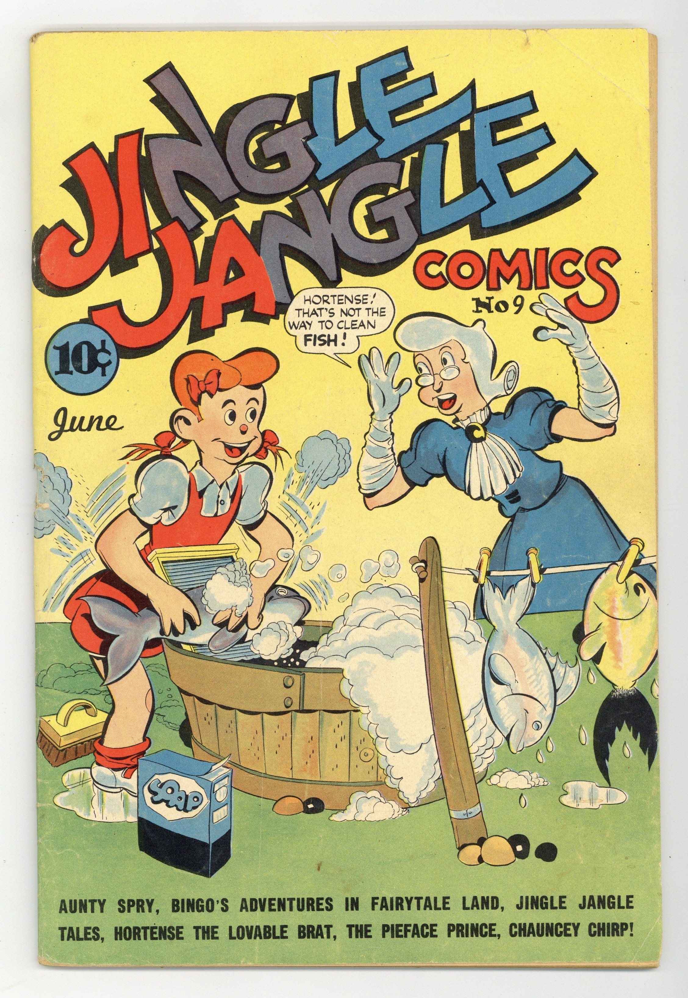 Stories and art by George Carlson, Ray Willner, Dave Tendlar, Sophie Ferstadt, and Louis Ferstadt. Kids' comics featuring the whimsical fables of beloved artist George Carlson, praised by Harlan Ellison as a "comic of the absurd." A Royal Lion and a Sunburnt Cheese-Cake can't find the Mole they're looking for, so they play cards instead. Aunty Spry's baseball team causes controversy when they put their sponsor's name on the uniforms (an uncommon practice at the time). The Green Witch forces The Pie-Faced Prince to play "punk" music on his piano, but a walking Book of Piano Lessons saves the day. Also featuring a public service announcement about wartime paper rationing. Puzzle-Time; Bingos Frolics in Fairytale Land; Jingle Jangle Tales: The Very Royal Lion and the Sunburnt Cheese-Cake; Aunty Spry; Chauncey Chirp and Johnny Jay; Forest Trial; Hortense the Lovable Brat; The Pie-Faced Prince of Pretzleburg; Susie Spring. 48 pages, Full Color. Cover price $0.10.