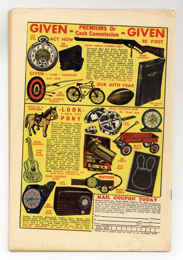 Cover art by Sol Brodsky. "The Masters!", art by Mort Drucker; Aliens land on Earth with the intention of destroying a dominant humanoid culture should they find one, but their observations of a man and his dog lead them to conclude that the humanoids are the servants of the animals and they depart. "Long Ago" text story. "The Magic Touch," script by Carl Wessler, art by Paul Reinman. "The Man In The Mirror," pencils by Jack Katz; Two beings in adjacent dimensions are advised by their psychologists to avoid sticking to rigid timetables and get rid of their problem of seeing a strange face in the mirror as they do their toilet. "Johnny's Flying Saucer," art by Angelo Torres; A boy wishes for a flying saucer to appear so that he won't have to rake leaves and one appears; The strange object attracts a crowd, which grind up the leaves so that the boy will have to work harder. "There Are Such Things," pencils by Tony DiPreta; A boy ill in the hospital receives a visit from a baseball manager's ghost who had promised he'd be there for his birthday before the man was killed in an automobile accident. 36 pgs., full color. Cover price $0.10.