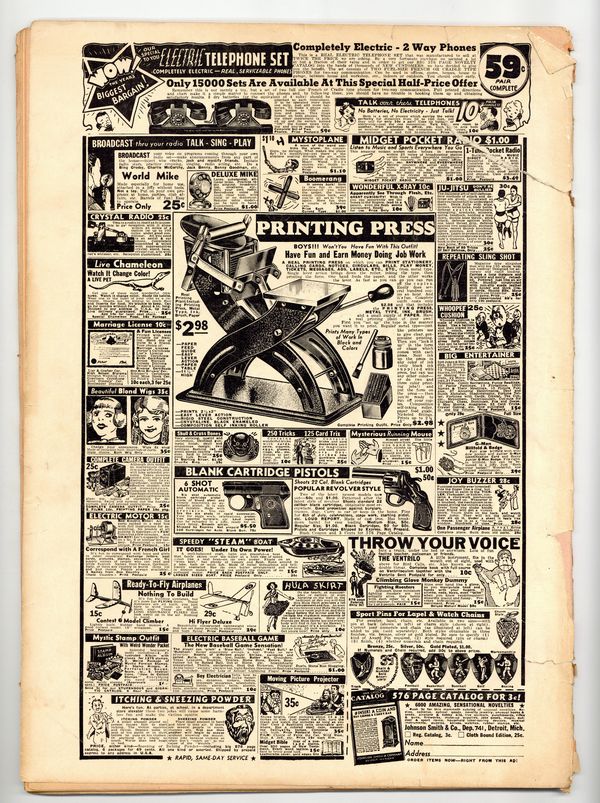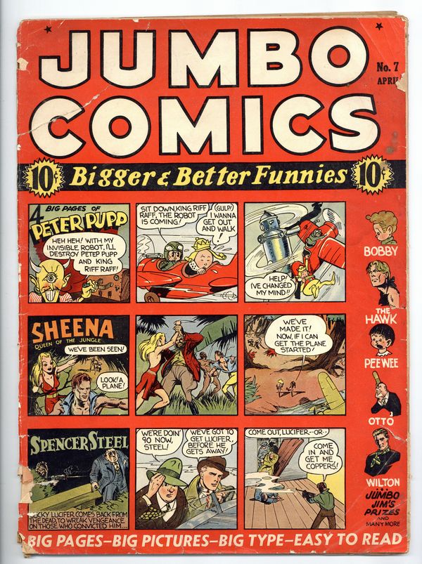 Cover by Will Eisner. Edited by Malcolm Reiss, Jerry Iger and Will Eisner. Stories and art by Will Eisner, Jerry Iger, Donald DeConn, Les Marshall, Lou Fine, Ed Laughlin, Mort Meskin, Bernard Baily, Dick Briefer, and Bob Kane. An influential anthology starring jungle hero Sheena, featuring early art by legendary comics artists in the Eisner-Iger Shop. Peter Pupp and King Riff Raff battle a giant invisible robot; Spencer Steel tries to halt Lucky Lucifer's deadly vendetta against those who crossed him; Sheena and Bob must fight their way to a plane and civilization. Peter Pupp; Hawks of the Seas; Bobby; Puzzle Phun; The Count of Monte Cristo; Spencer Steel; The Diary of Dr. Hayward; Uncle Otto; News Facts; Jest Laffs; Pee Wee; Sheena, Queen of the Jungle; Modern Planes and Model Building; Gilda Gay; Ken Hammond; The Hunchback of Notre Dame; The Adventures of Tom Sherrill; ZX-5 Spies In Action; Heroes of Sport; Stars on Parade; Inspector Dayton; Wilton of the West. 10 1/2-in. x 14 1/2-in., 30 pages, B&W. Cover price $0.10.