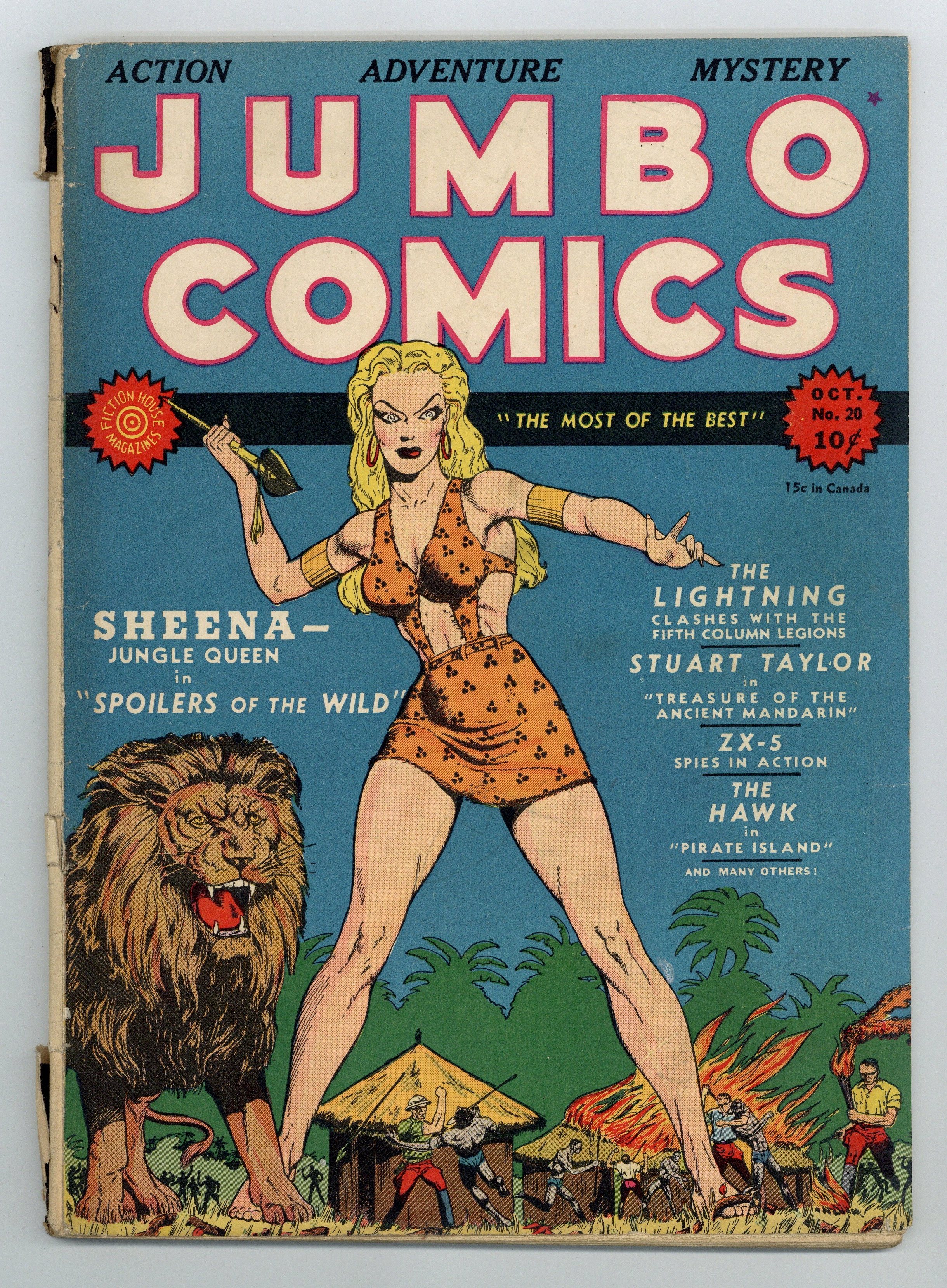 Cover by John Celardo. Edited by Malcolm Reiss, Jerry Iger and Will Eisner. Stories and art by Will Eisner, Jerry Iger, Charles Wotjkoski, Charles Sultan, Charles A. Winter, John Celardo, Bob Kane and Bob Powell. An influential anthology starring jungle hero Sheena, featuring early art by legendary comics artists in the Eisner-Iger Shop. The Hawk ventures onto Pirate Island; Inspector Dayton investigates The Case of the Crooked Dagger; A reprint of the Bob Kane Peter Pupp story from issue #3. Peter Pupp; The Hawk; Weird Stories of the Supernatural; Bobby; Uncle Otto; Sheena, Queen of the Jungle; Visitor from Space; ZX-5 Spies In Action; Inspector Dayton; Lightning; Wilton of the West. 64 pages, Full Color. Cover price $0.10.