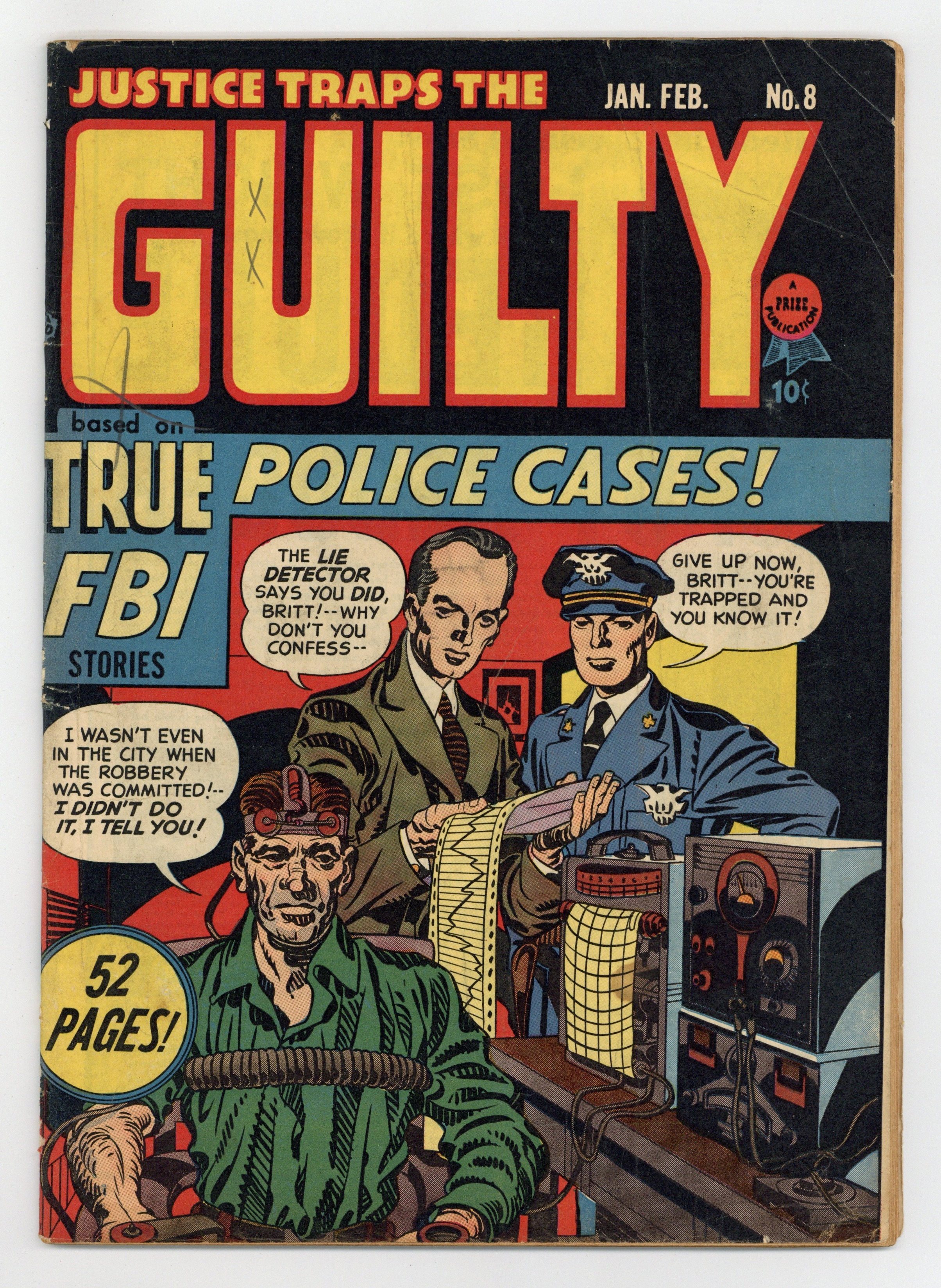 Published Feb 1949 by Prize/Headline.$72.00Cover pencils by Jack Kirby. The Fall of Classy Eddie Bentz--Underworld Snob, pencils by Jack Kirby; a story about Eddie Bentz, one of the craftiest crooks the FBI ever face. The Violent Mr. Peace; Charles Peace, one of the most successful burglars to ever plague Scotland Yard, is tripped up by a piece of evidence. Eugene Vidocq...First Great Detective, pencils by Bernard Krigstein. The First Hundred Are the Hardest text story. End of a Blackmailer, art by Manny Stallman. The Man Who Was Ashamed of Doing Good...Joe Slade, Wild West Jekyll and Hyde Desperado!, pencils by Will Elder. The Masked Killer text story, pencils by Jack Kirby. Ad for Young Romance and Young Love comics. 52 pgs. $0.10. Cover price $0.10.