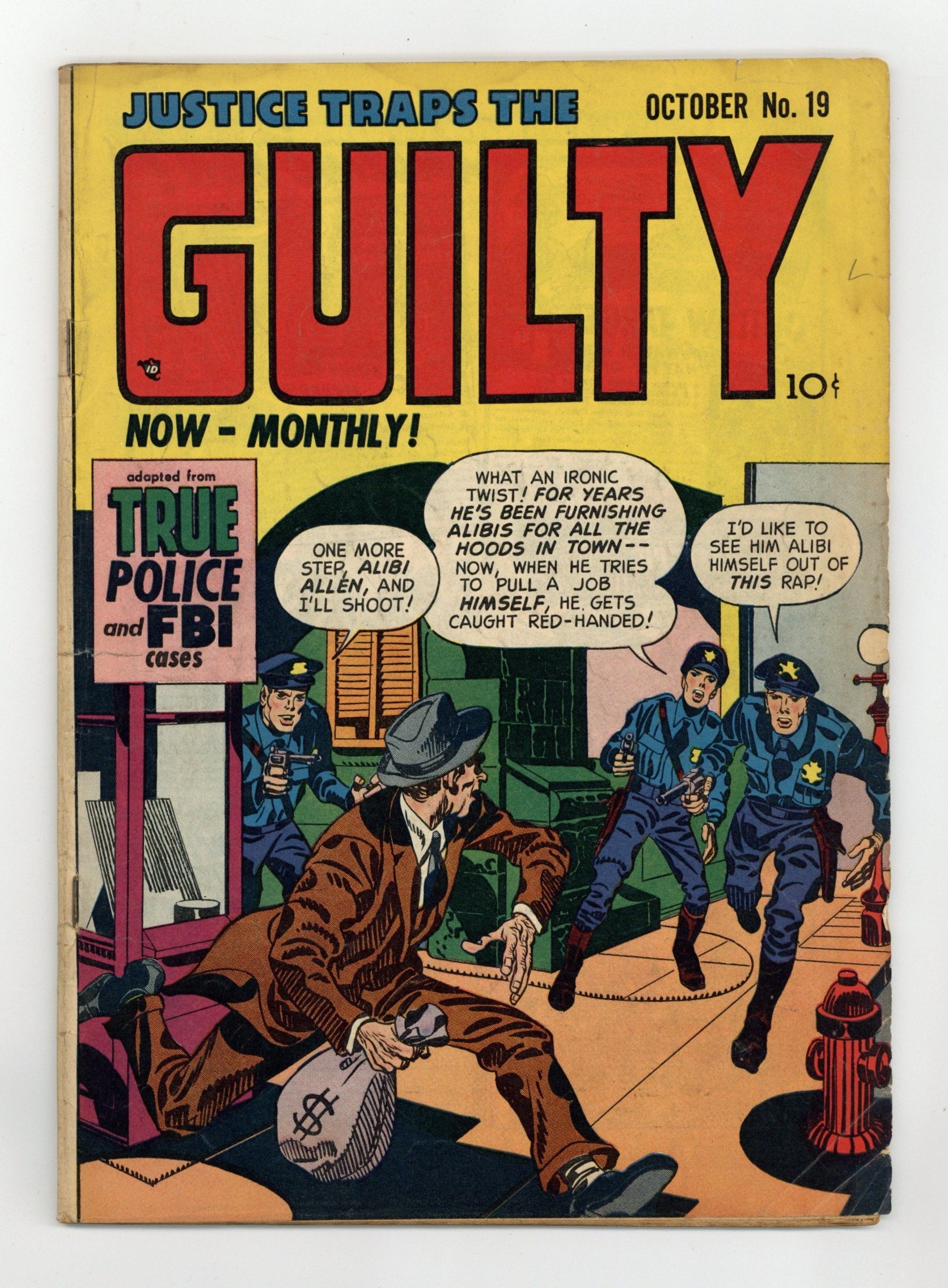 Published Oct 1950 by Prize/Headline.$29.00Cover by Jack Kirby. Art by Ross Andru and Mort Meskin. Pioneering crime comic Justice Traps the Guilty was produced by the studio of comics legends Joe Simon and Jack Kirby, creators of Captain America. A hood helps other crooks by providing alibis for their crimes, but provides no alibi for himself. Scotland Yard has seven days to catch a killer before he strikes again. Frank sets out to take over the waterfront gangs. Alibi Guy; Closeups; The 7th Day; The Self-Made Mouthpiece; Fortune in Furs; Elusive Braggart; The Big Idea Man; Deadlier Than the Male. 48 pages, Full Color. Cover price $0.10.