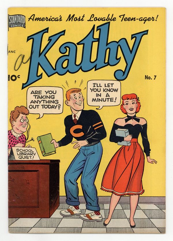 Published 1950 by Standard Comics.$60.00Contains teen humor stories. All "Kathy" comic story art by Clark Haas. In order of appearance: "Kathy in 'Classroom Capers!'"; "Bingo in 'Woman Hater'"; "Kathy in 'On With the Dance!"; "Myrtle in 'Not So Dumb'"; and "Kathy". "Say It With Music: Would Milt Crawley Find Marilyn Too Simple and Naive?" illustrated text story by Margaret Isbell. 36 pages. Full color. Cover price $0.10.