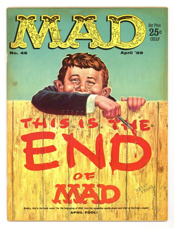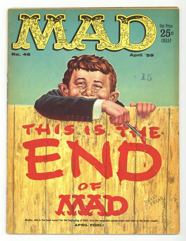 Cover art by Kelly Freas. Parody of ad for RCA Victor color televisions, art by Kelly Freas. "Sunday Evening Television Roulette," script by Gary Belkin, art by Mort Drucker; The interesting TV viewing you could have by constantly switching channels between ABC, NBC, and CBS. "The Suicide," script and art by Don Martin. "Authentic Sounds In Stereo," script by Tom Koch, art by Wally Wood; Ridiculous extremes to the trend for "real sounds" on stereo records. "How High-Class Magazines Can Use Low-Class Pictures," script by Frank Jacobs, art by Joe Orlando; Shows how the same photo can be used by many different publications, through cropping. "Western Weapons Of The Future," script by Larry Siegel, art by George Woodbridge; Various things TV western heroes might use as weapons, if the trend away from guns continues. "The Hidden Persuaders Become The Hip Persuaders," script by Gary Belkin, art by Wally Wood; Parodies of ads, using hip language and celebrities. "How To Choose And Train Your Master," script by Frank Jacobs and Robert Margroff, art by George Woodbridge; Excerpts from a book written by a dog, on what to look for and how to train a master. "MAD's Modern Handy Phrase Book For The American Tourist," script by Sy Reit, art by George Woodbridge. "If Famous Authors Wrote The Comics," script by Frank Jacobs, art by Wally Wood; Various comic strips written in the styles of: Paddy Chayefsky; Gilbert & Sullivan; Rudyard Kipling; Walt Whitman; Rogers & Hammerstein; Tennessee Williams; Edgar Allan Poe; Mickey Spillane. "MAD's Cut-Rate Success Symbols," script by Sy Reit, art by Joe Orlando. "Movies Are Emptier Than Ever," script and art by Dave Berg; Showing how theaters can attract more patrons by remodeling to be more like watching TV at home. "The Happy Endings Weren't So Happy," script by Sy Reit, art by Bob Clarke; Thoughts on what happened after the end of several fairy tales. 52 pgs., B&W. Cover price $0.25.