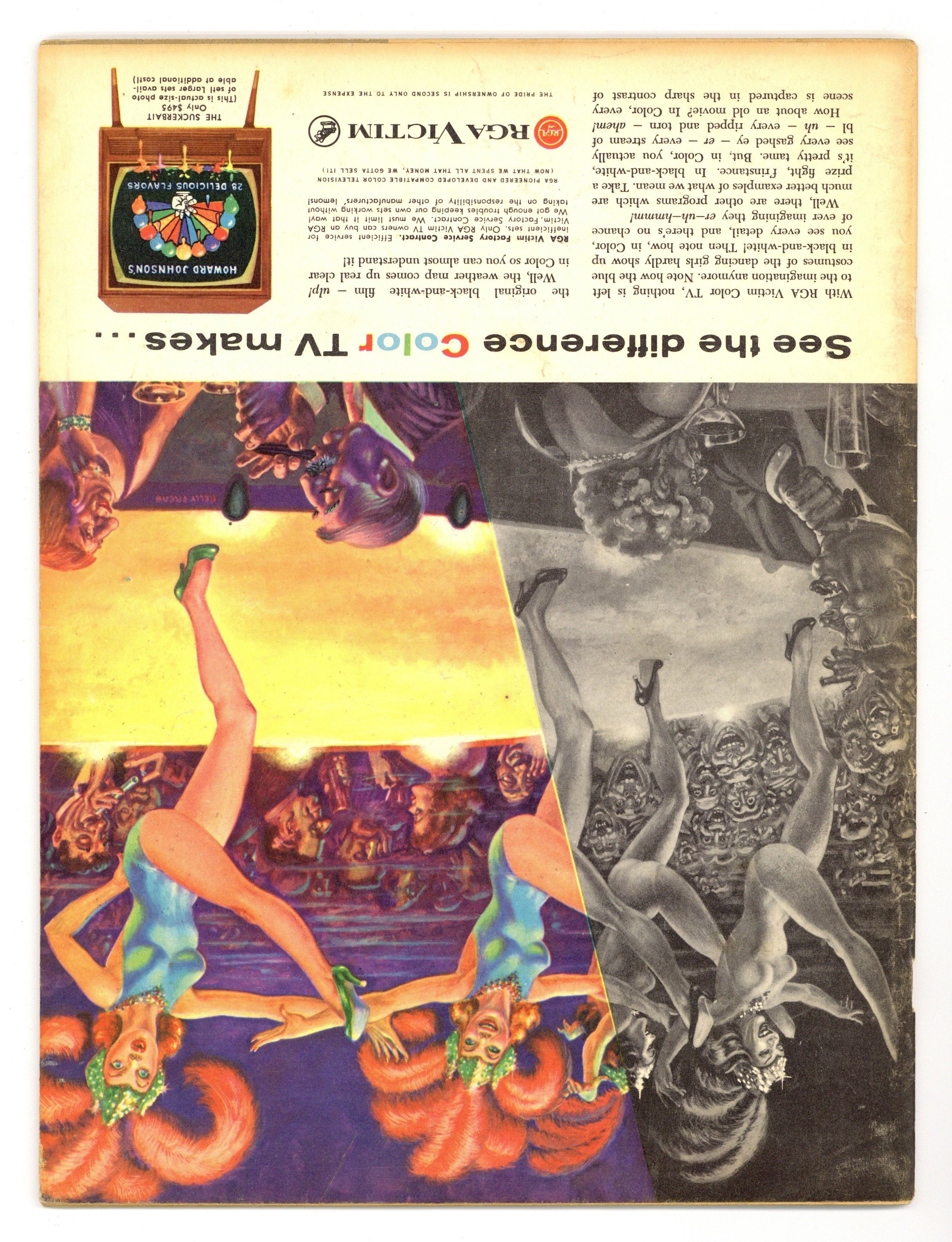 $20.00Cover art by Kelly Freas. Parody of ad for RCA Victor color televisions, art by Kelly Freas. "Sunday Evening Television Roulette," script by Gary Belkin, art by Mort Drucker; The interesting TV viewing you could have by constantly switching channels between ABC, NBC, and CBS. "The Suicide," script and art by Don Martin. "Authentic Sounds In Stereo," script by Tom Koch, art by Wally Wood; Ridiculous extremes to the trend for "real sounds" on stereo records. "How High-Class Magazines Can Use Low-Class Pictures," script by Frank Jacobs, art by Joe Orlando; Shows how the same photo can be used by many different publications, through cropping. "Western Weapons Of The Future," script by Larry Siegel, art by George Woodbridge; Various things TV western heroes might use as weapons, if the trend away from guns continues. "The Hidden Persuaders Become The Hip Persuaders," script by Gary Belkin, art by Wally Wood; Parodies of ads, using hip language and celebrities. "How To Choose And Train Your Master," script by Frank Jacobs and Robert Margroff, art by George Woodbridge; Excerpts from a book written by a dog, on what to look for and how to train a master. "MAD's Modern Handy Phrase Book For The American Tourist," script by Sy Reit, art by George Woodbridge. "If Famous Authors Wrote The Comics," script by Frank Jacobs, art by Wally Wood; Various comic strips written in the styles of: Paddy Chayefsky; Gilbert & Sullivan; Rudyard Kipling; Walt Whitman; Rogers & Hammerstein; Tennessee Williams; Edgar Allan Poe; Mickey Spillane. "MAD's Cut-Rate Success Symbols," script by Sy Reit, art by Joe Orlando. "Movies Are Emptier Than Ever," script and art by Dave Berg; Showing how theaters can attract more patrons by remodeling to be more like watching TV at home. "The Happy Endings Weren't So Happy," script by Sy Reit, art by Bob Clarke; Thoughts on what happened after the end of several fairy tales. 52 pgs., B&W. Cover price $0.25.
