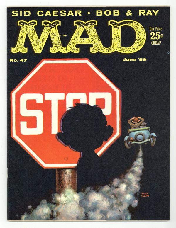 $37.00Cover art by Kelly Freas. "Combined Television Shows," script by Paul Laikin, art by Mort Drucker; Explores combinations of 2 TV shows into one, with disastrous results. "Mother's Day Cards From Special People," script by Frank Jacobs, art by Bob Clarke. "It Happened On The Crosstown Bus," script and art by Don Martin; A man is attacked in an unusual way. "How To Be A MAD Non-Conformist," script by Sy Reit, art by George Woodbridge. "Little League," script and art by Dave Berg; The future of kids' baseball as Little League becomes ever more organized. "The Battle of The Credit Cards," script by Al Jaffee, art by Bob Clarke; Unlikely businesses that you can charge and a journal of how credit cards work for business expenses. "The Professor Lectures On Space," script by Sid Caesar, art by Wally Wood; The professor gives an incoherent lecture, concerned more about situations on earth than in space. "Jack And Jill As Retold By Various Magazines," script by Paul Laikin, art by Joe Orlando; The nursery rhyme retold as tales of romance, adventure and crime. "Future Halls Of Fame," script by Frank Jacobs, art by George Woodbridge; Inductees into various Halls of Fame we might see, if the trend of establishing these for just about any occupation or hobby in sight continues. "The Greatest Missile Ever Built," script by Al Jaffee, art by Wally Wood; Detailing the need for and design of an undetectable missile weapon. "Pressure Can Report," script by Bob Elliott and Ray Goulding, art by Mort Drucker; Fenwick shows us how stuff and air are put into aerosol spray cans and previews some new spray products. "First Aid Handbook," script by Frank Jacobs, art by Wally Wood; Bad advice on how to treat common injuries, including how to cause them. Phony ad for dressmakers' colored tissue paper; parody of Scott Tissue ad, art by Kelly Freas. 52 pgs., B&W. Cover price $0.25.