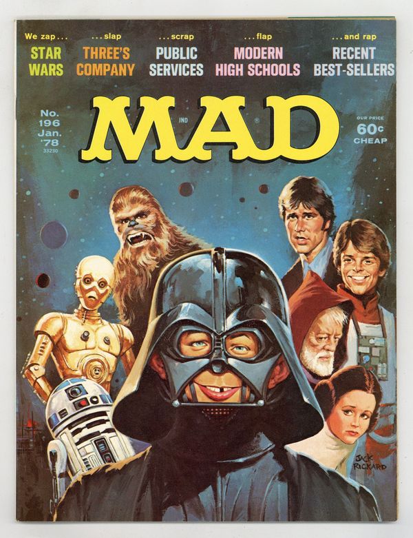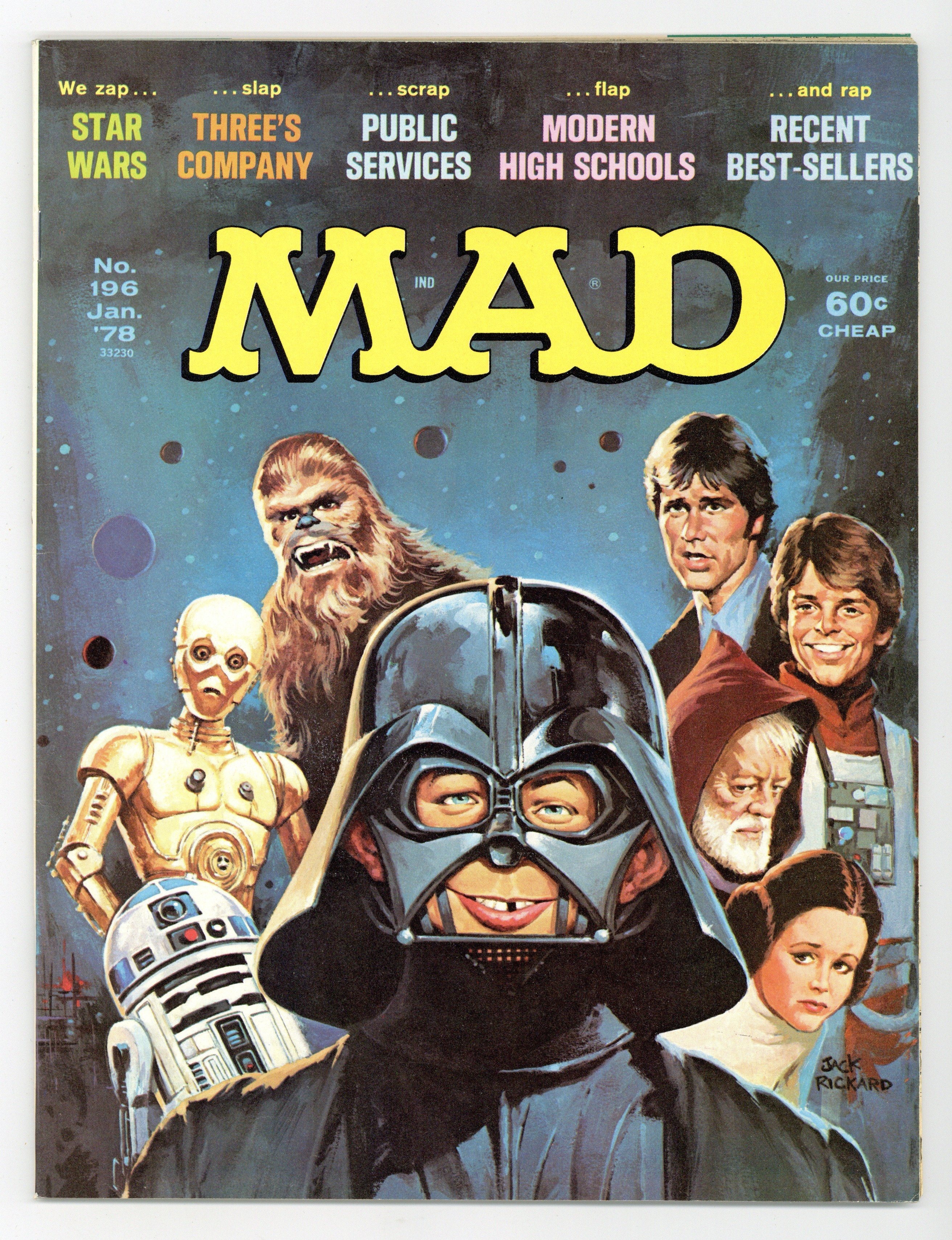 Cover by Jack Rickard. Stories and art by Don Martin, Al Jaffee, Larry Siegel, Arnie Kogen, Lou Silverstone, Don (Duck) Edwing, Stan Hart, Paul Peter Porges, Dick DeBartolo, Frank Jacobs, Bob Clarke, Mort Drucker, Harry North, Esq., Paul Coker Jr., Angelo Torres, Jack Rickard, Jack Davis, Dave Berg, and Sergio Aragones. Spoofs of Star Wars (the first of many to come) and TV sitcom Three's Company, featuring art by Mort Drucker and Angelo Torres. A board game based on hospital stays, and an article about public services being run like private businesses. Mad's takes on fan mail, high school, and literary agents. Classic Don Martin strips, Lighter Side strips by Dave Berg, and Marginals by Sergio Aragones. Plus a look at Mad editions for other countries, and a photo of Mad publisher William Gaines dressed as Santa Claus. Star Roars; Early One Morning in South America; Mad's "Realistic" Board Game - "Hospital"; Mad Diplomacy in Everyday Life Situations; If Celebrities Answered Their Own Fan Mail; The Lighter Side of Water; Late One Afternoon in South Dakota; If Public Services Were Run Like Private Enterprise; Mishaps of the Future; Mad's Literary Agent of the Year; A Mad Look at a Modern High School; Inventions We'd Like to See; Early One Evening in Atlantic City; He's Company; Fold-In; A Fairy Tale. 8.5-in. x 11-in., 48 pages, B&W. Cover price $0.60.