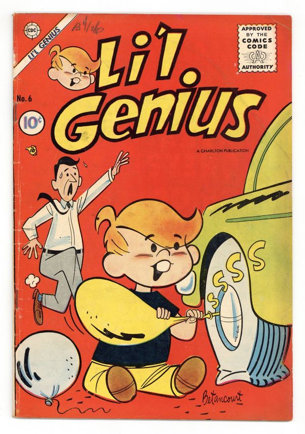 Published Jul 1955 by Charlton Comics Group.$14.00Cover by Harry Betancourt. Stories and art by Rudy Cristiano and A. W. Nugent. Numbering continues from Super Brat (1954) #4, skipping issue #5; the character was still being billed in stories as Superbrat the Li'l Genius. Ollie is a terrible baseball player and the park attendant won't let him play, but luckily, Ollie's still got the tattered cape that gives him superpowers. Trying to rescue a drowning swimmer at the beach, Super Brat accidentally hauls in a marker buoy, and a ship runs aground. Super-powered Ollie is a baby-sitter's worst nightmare. Take Me Out to the Ballgame!; A Day at the Beach!; The Manager; The Dog Who Couldn't Bark; A Night Out!; Play Fun. 32 pages, Full Color. Cover price $0.10.