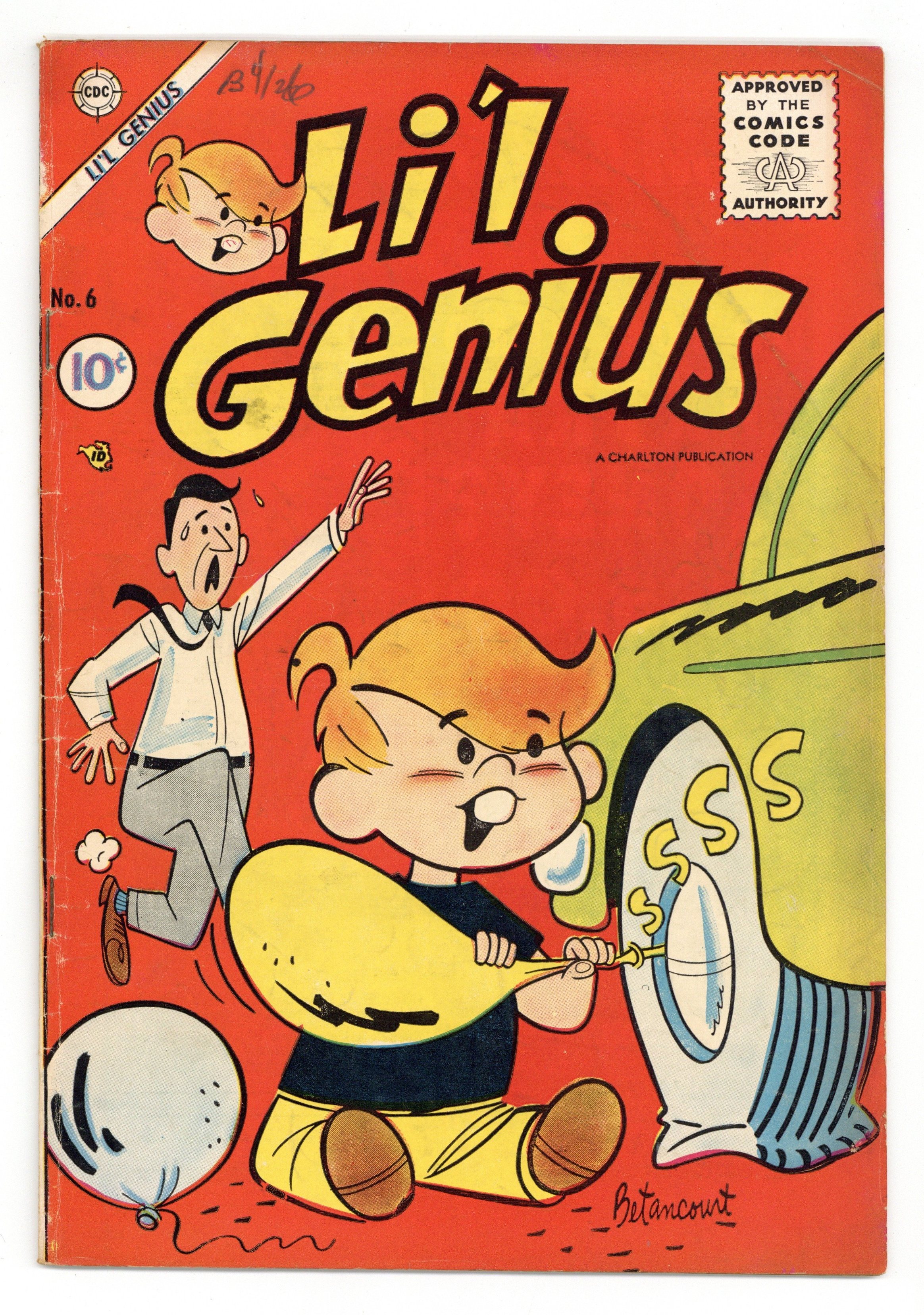 Published Jul 1955 by Charlton Comics Group.$13.50Cover by Harry Betancourt. Stories and art by Rudy Cristiano and A. W. Nugent. Numbering continues from Super Brat (1954) #4, skipping issue #5; the character was still being billed in stories as Superbrat the Li'l Genius. Ollie is a terrible baseball player and the park attendant won't let him play, but luckily, Ollie's still got the tattered cape that gives him superpowers. Trying to rescue a drowning swimmer at the beach, Super Brat accidentally hauls in a marker buoy, and a ship runs aground. Super-powered Ollie is a baby-sitter's worst nightmare. Take Me Out to the Ballgame!; A Day at the Beach!; The Manager; The Dog Who Couldn't Bark; A Night Out!; Play Fun. 32 pages, Full Color. Cover price $0.10.