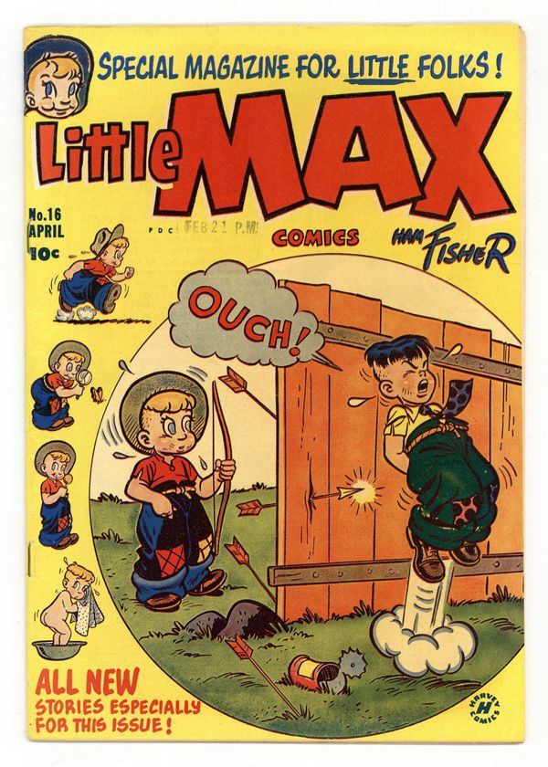 $22.00Stories and art by Warren Kremer and others. Joe Palooka's speechless sidekick from the popular Ham Fisher boxing strip gets his own comic, noteworthy for early versions of Little Dot and other Harvey characters. Little Max continues his adventures as the hero of famous stories, but this issue features the un-p.c. legend sometimes known as The Boy and the Tigers. Casey wants to bring only one thing to eat while hiking with Little Max, so he brings the biggest vegetable he can find. Max is chosen to be the "piper" for the neighborhood basketball game, but that means he's the only one small enough to crawl into a pipe to get the ball. Plus solo stories featuring Rags Rabbit and Humphrey. Light Lunch; Humphrey: Hot Dip; Game Page; The Mysterious Shadow; Size Isn't Everything; Little Max Rhymes with Reason; On the Beam; The Piper; Wouldn't It Be Funny?; Peter, the Singer; Funny Face. 32 pages, Full Color. Cover price $0.10.