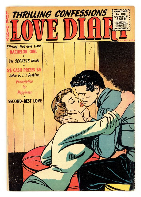 Cover by John Buscema. Stories and art by John Buscema, Bill Woolfolk, Bob Rogers and Mort Leav. A post-war, pre-Code romance comic from pioneering female publisher Rae Herman of Orbit-Wanted (who doubled as Love Diary's advice columnist, Ray Mann). Published ten months after issue #47; first issue with the Comics Code seal on the cover. Neither Judy nor Jerry wants marriage, but meeting each other might change their minds, in one of three early stories (and cover) in this issue by future Marvel and Conan legend John Buscema. Buscema also drew the Prescription for Happiness story, in which Peter and Elizabeth's romance is derailed by Peter's domineering mother. Plump Nancy keeps losing her boyfriends to slim sister Pat, but then realizes it's not her weight that's the problem. Bachelor Girl; I Was a Fat Girl!; Prescription for Happiness; Best Love! Final issue of the series. 32 pages, Full Color. Cover price $0.10.