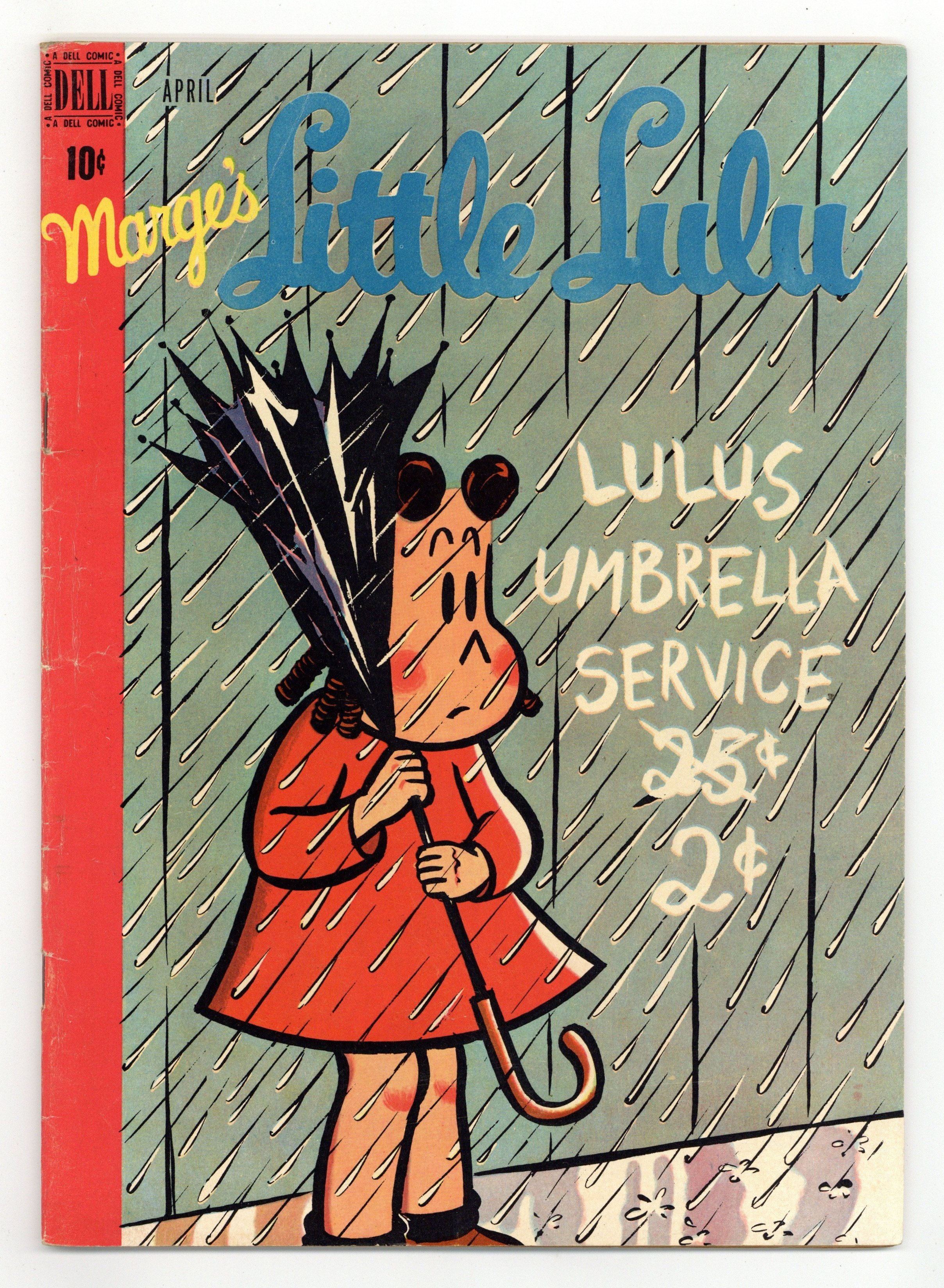 Published Apr 1950 by Dell/Gold Key.$19.00Cover art by John Stanley. Alvinsitting; Lulu is baby-sitting for Alvin and he locks her out of the house. Haunted Delivery; Tubby makes a drugstore delivery to a house of ghosts. Lulu's Umbrella Service; Wilbur hires Lulu to take him home under her umbrella. The Unseen Enemy; Tubby is scared when he gets an anonymous threatening phone call. North Pole; Lulu tells Alvin about when she discovered the North Pole. All scripts by John Stanley, art by Irving Tripp. Two-page text story, Lulus Diry ("Diary"). Back cover has advertisement for five color Little Lulu pinups. 52 pages, full color. Cover price $0.10.