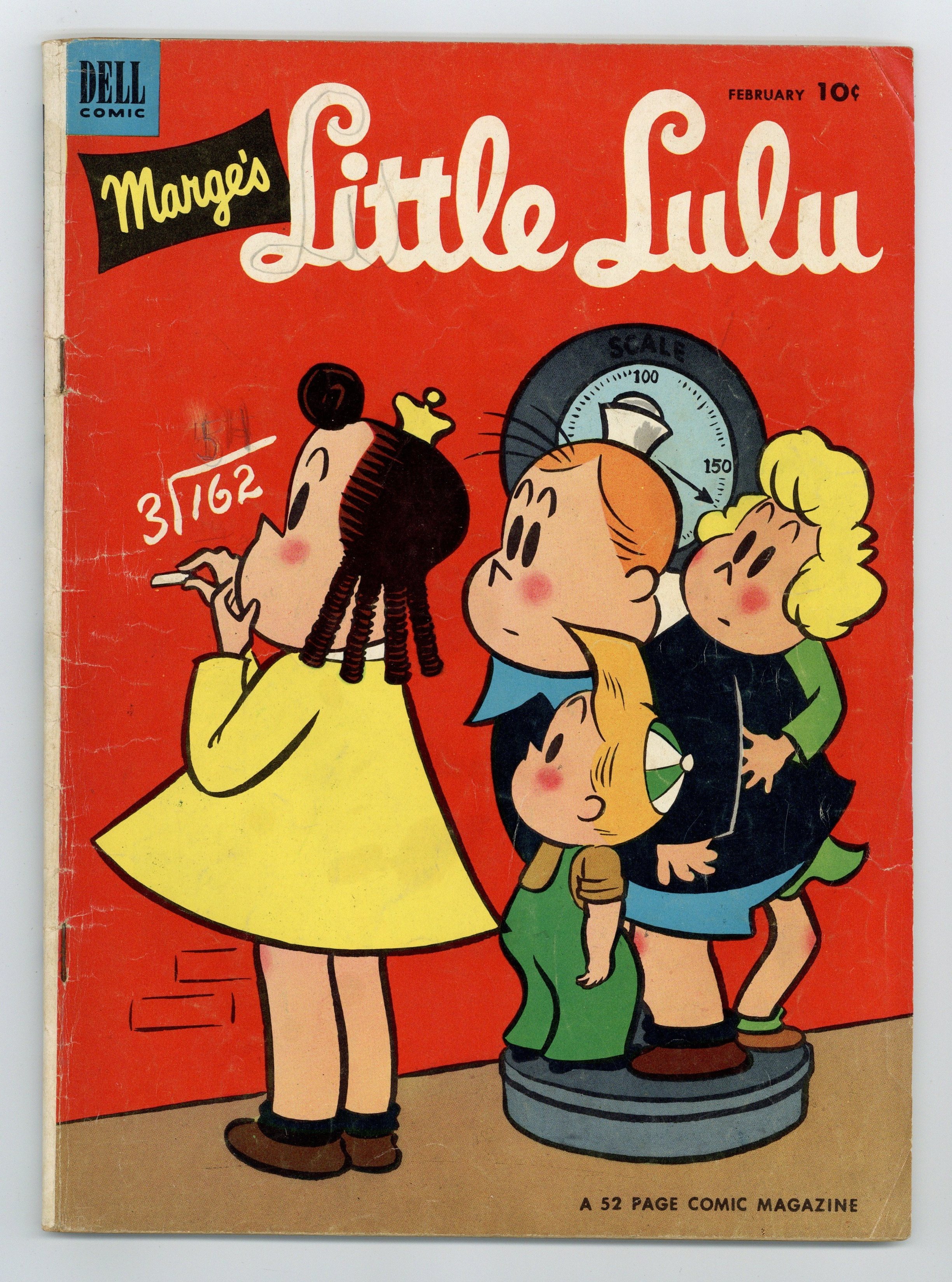 Cover pencils by John Stanley. The Downfall of Mr. McNabbem; Lulu picks up her principal's forgotten pipe at home and is chased by Mr. McNabbem. Elephant Ride; Lulu and Alvin are on a runaway circus elephant. Space Kids; Lulu thinks the Fellers have gone to Mars in their homemade space ship. The Little Pink Cloud; Lulu tells Alvin about the little girl who tried to catch a cloud. The Buzzard; A very jealous Tubby follows Wilbur and Gloria on a date to the amusement park. All scripts and pencils by John Stanley, inks by Irving Tripp. Two-page text story, Lulus Diry ("Diary"). 52 pages, full color. Cover price $0.10.
