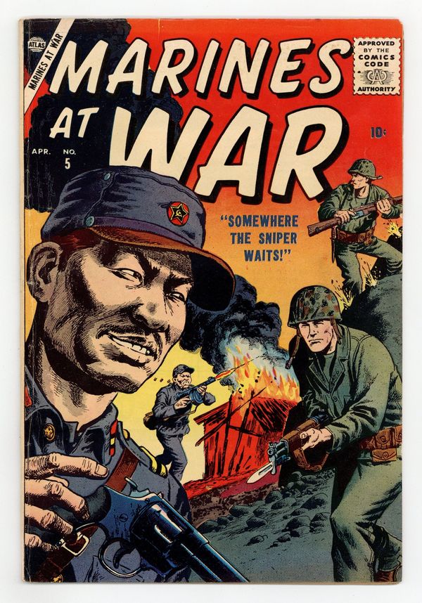 $30.00First issue of the series (continued from Tales of the Marines). "Amtracs" (art by Mort Drucker), "Suicide Mission" (art by Gene Colan), "Out of the Wreckage" (art by Cal Massey), "Somewhere the Sniper Waits," "The Battle of Belleau Woods" (art by Joe Maneely), and a two-page text story, "Cloak and Dagger." John Severin cover. Cover price $0.10.