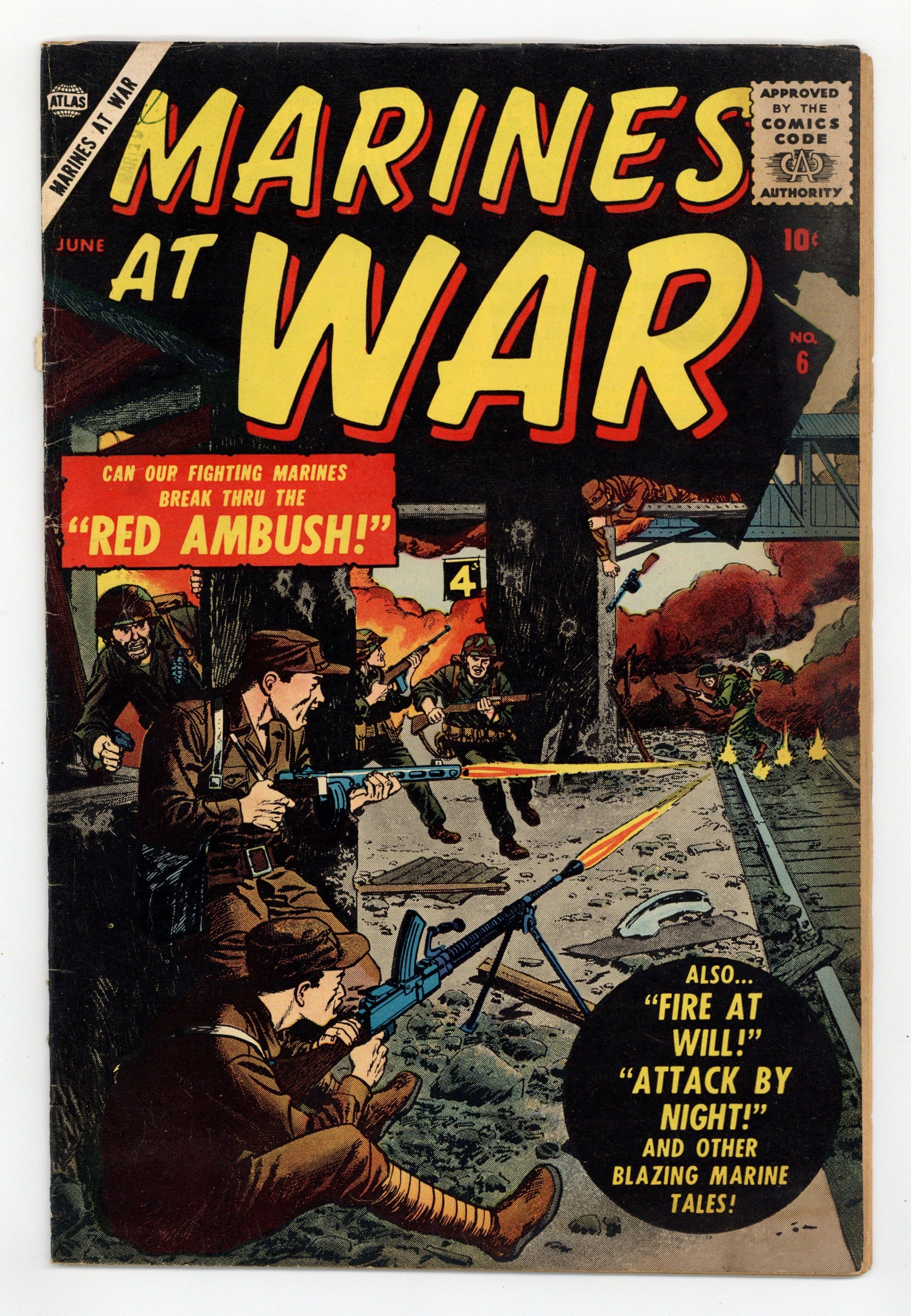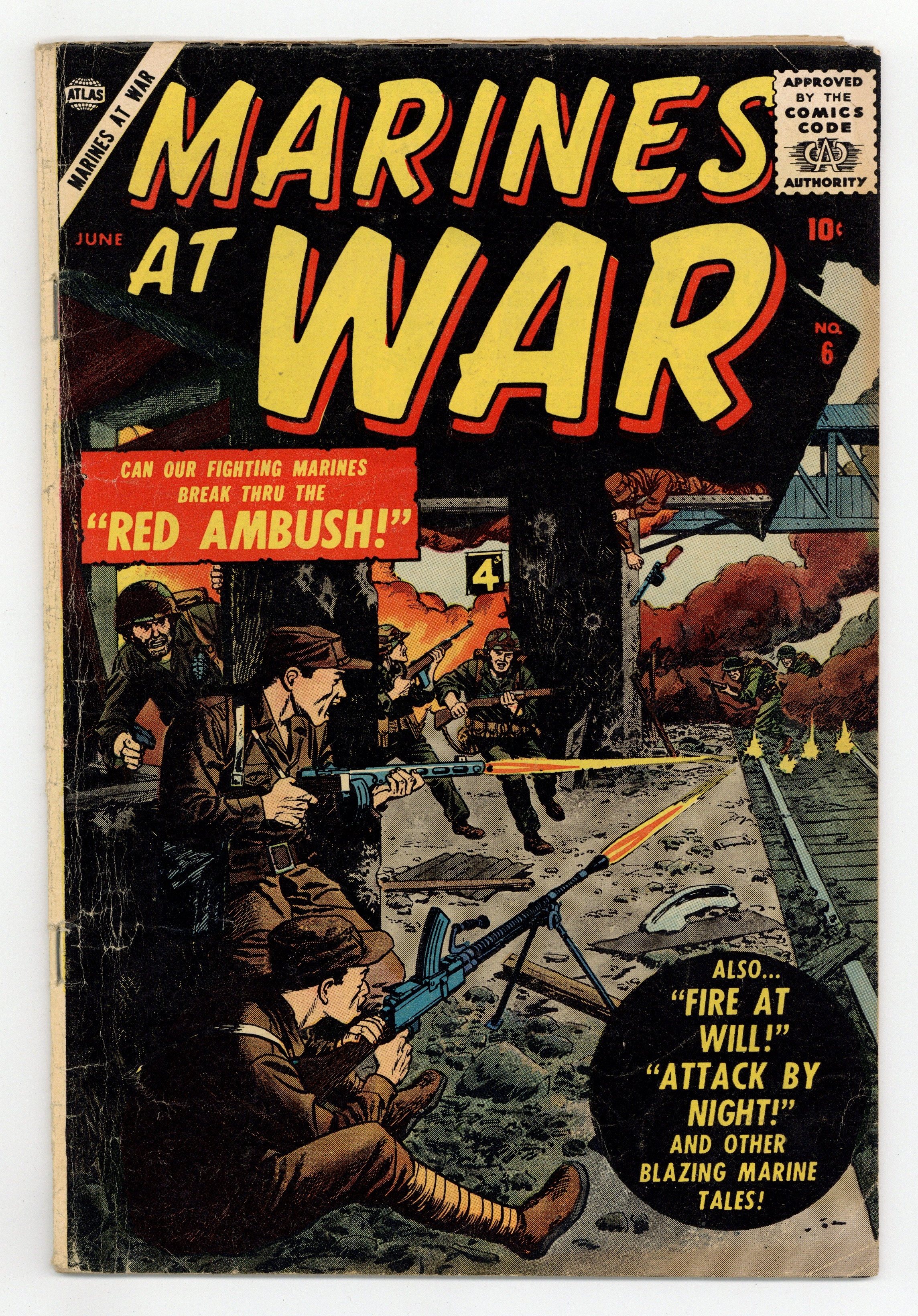 "Red Ambush!" (art by Gene Colan), "Attack By Night" (art by Syd Shores?), "Fire At Will," "Belleau Woods," "The Barrier," and a two-page text story, "Men of Scotland." Cover price $0.10.