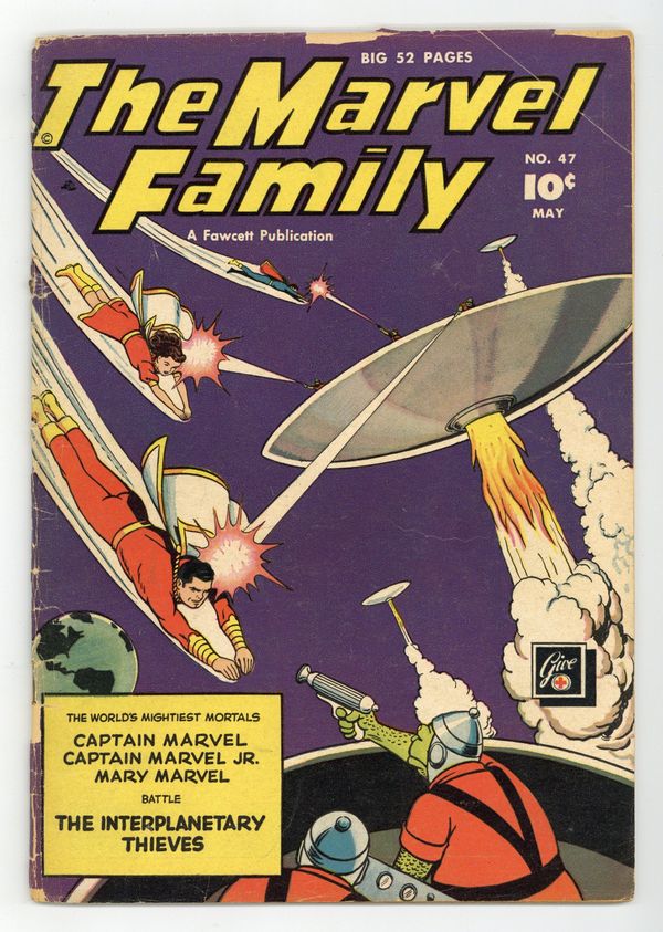 Stories and art by Otto Binder, Sheldon Moldoff, Kurt Schaffenberger, and Howard Boughner. Fawcett's most popular heroes, the original Captain Marvel (Shazam) and family, in solo and shared adventures. The Marvel Family discovers that Earth's natural resources are being depleted by saucer aliens, in a story with an ecological bent (long before that was a popular concept). Mary Todd, dissatisfied with her appearance, begins researching the ability of chameleons to change their appearance, becoming... Chameleon Girl! A scientist discovers a method to enlarge insects to gigantic sizes, foreshadowing any number of 1950s monster movies, and Captain Marvel, Jr. must deal with the consequences. The Marvel Family and the Interplanetary Theft!; Capt. Marvel Jr. and the Worm that Grew!; Mary Marvel Meets the Chameleon Girl!; The Marvel Family Puzzle Page; Kanvasback; Lazy Lee; The Marvel Family Puzzle Page; Headline Harry; Captain Marvel and the Mysterious Migration; Horse Trader Hawley. 48 pages, Full Color. Cover price $0.10.