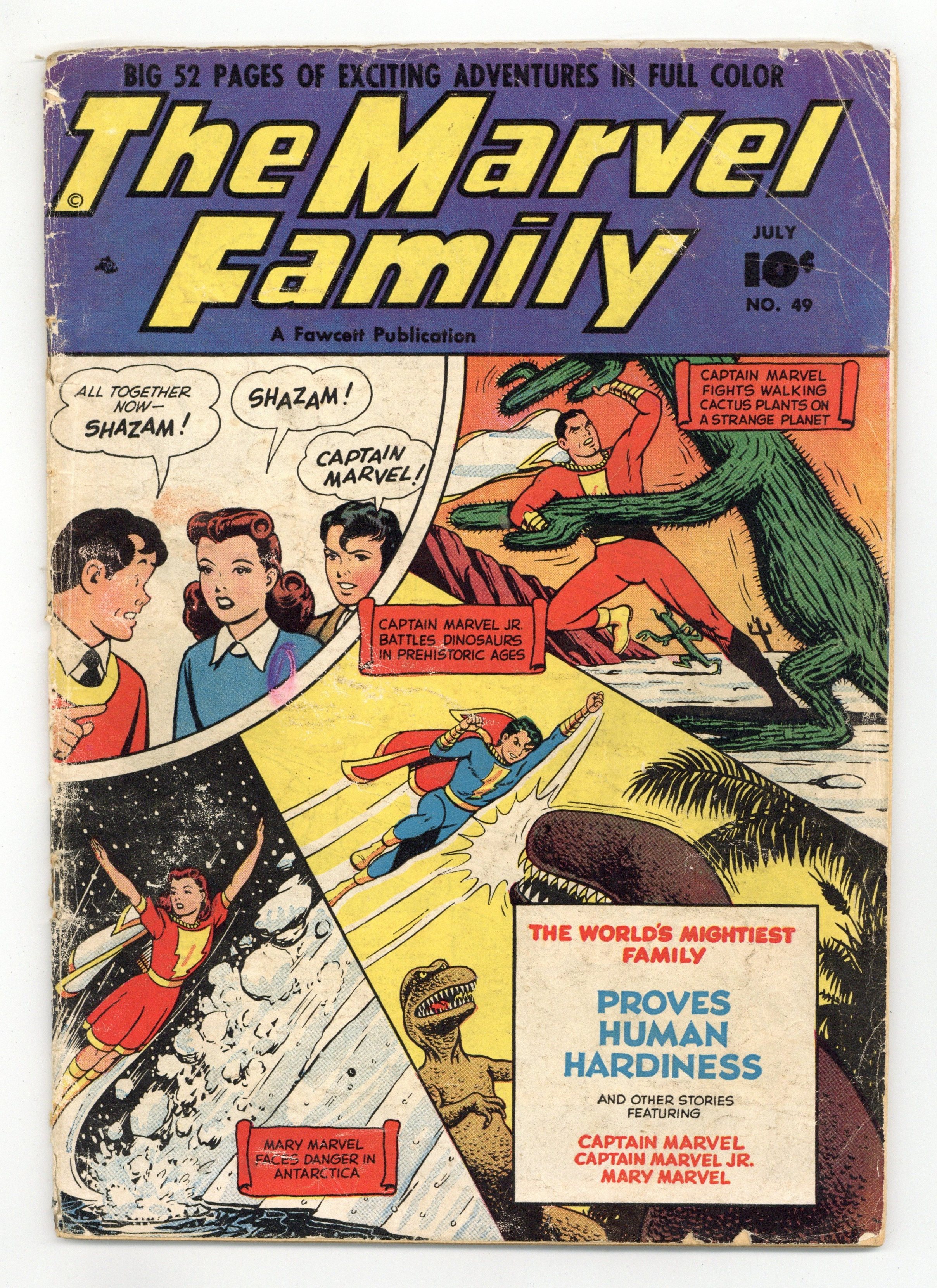 Cover by C. C. Beck. Stories and art by Otto Binder, C. C. Beck, Pete Costanza, Bill Ward, Kurt Schaffenberger, Pete Riss and Howard Boughner. Fawcett's most popular heroes, the original Captain Marvel (Shazam) and family, in solo and shared adventures. To earn money for charity, The Marvel Family must survive for one day in Antarctica, the dinosaur era, and a desert planet populated by cactus-people...while in their human identities of Billy, Mary and Freddy. Bored with having heard every joke ever, the Roman god of laughter obliterates humor from the world, in a story with art by Torchy creator Bill Ward. Mary Marvel can't figure out why full-grown adults are suddenly acting like children. Plus a vintage ad for wallets, belts and suspenders featuring movie cowboy Roy Rogers. The Marvel Family Proves Human Hardiness; Lazy Lee; The Marvel Family Puzzle Page; Headline Harry: The Egg-asperating Scoop; Capt. Marvel Jr.: The Ban on Laughter; Mary Marvel: The Adult Children; Farmer Frammis; Freshman Freddy: The Big Dance; Danger on the Dock; Captain Marvel: The Million Dollar Tasks. 48 pages, Full Color. Cover price $0.10.