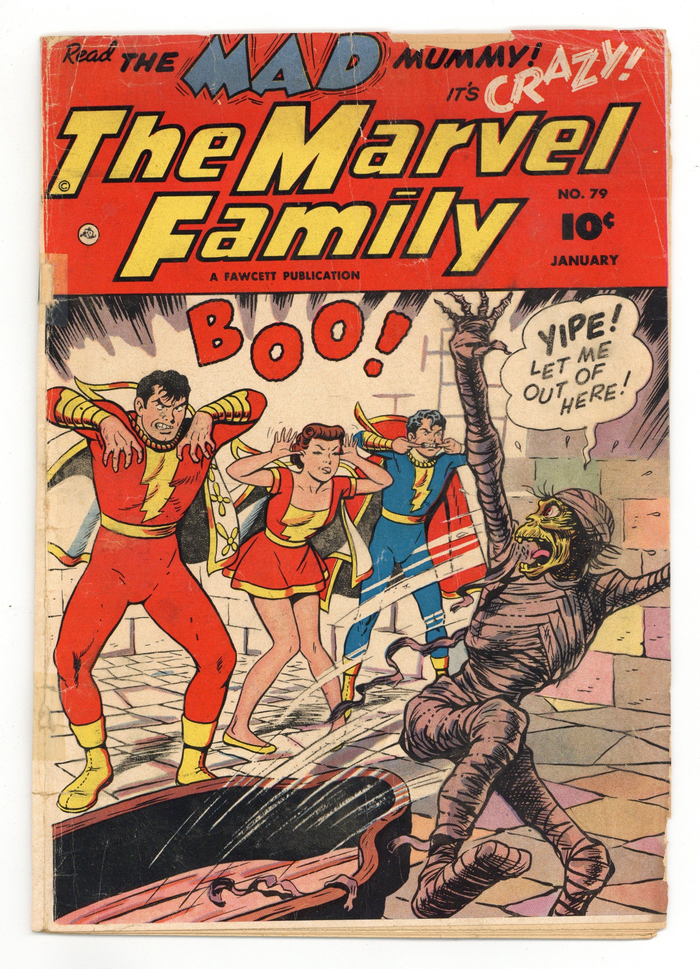 Stories and art by Otto Binder, Kurt Schaffenberger and Howard Boughner. Fawcett's most popular heroes, the original Captain Marvel (Shazam) and family, in solo and shared adventures. In an issue-length, multi-part adventure, The Marvel Family battles an ancient mummy that has been revived with evil intent. The story finds them lifting a pyramid, catching a plummeting Sphinx, and being struck with "the weird silence of the sphinx" so they cannot say their power words. The Marvel Family Battles the Dynasty of Horror, Chapter One: The Mad Mummy; Crooks in the Broth; Lazy Lee; Boxcar Benny; The Marvel Family Puzzle Page; Chapter Two: The Horn of Howling Horrors; Headline Harry: The Courthouse Scoop; Substitute for Error; Chapter Three: The New Pyramid of Peril. 32 pages, Full Color. Cover price $0.10.