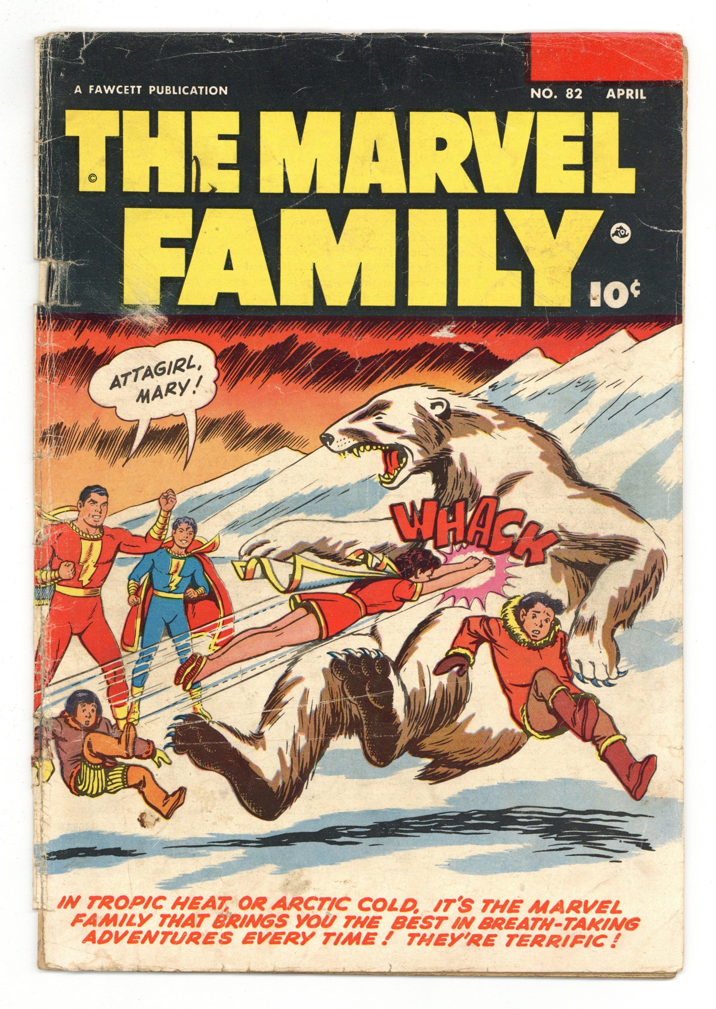 Cover by C. C. Beck. Stories and art by Otto Binder, Kurt Schaffenberger and Howard Boughner. Fawcett's most popular heroes, the original Captain Marvel (Shazam) and family, in solo and shared adventures. In another Korea/Cold War story, monstrous animals are unleashed on US soldiers. But the G.I.-dog combo of Hank and Yank (Yank's the dog) helps The Marvel Family defend the good guys. In a multi-part adventure, the Ice King freezes a mining town and steals gold to build a giant version of his freeze ray, unless the Marvels can stop him. The Beast Battalions; Murder Mart; Lazy Lee; Boxcar Benny; The Marvel Family Puzzle Page; Headline Harry: The Reckless Wreck; The Fantastic Freezing Furies, Chapter One: The March of the Glaciers; Chapter Two: Menace of the Ice King; Chapter Three: The Frozen Horror. 32 pages, Full Color. Cover price $0.10.