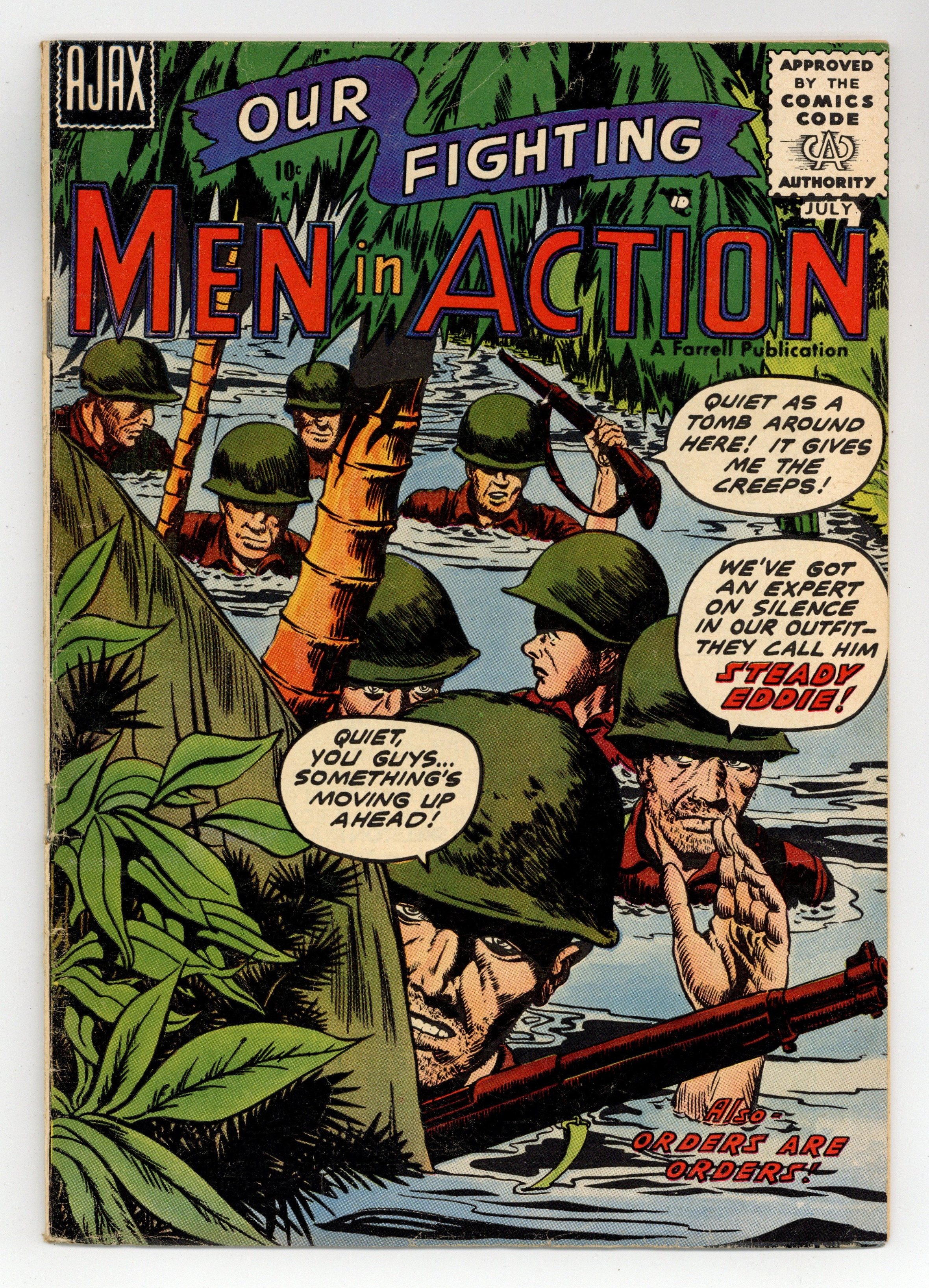 Cold War-era military action tales from Ajax-Farrell and the anonymous talents in the Iger Shop. Lt. Smithers must remove dangerous booby traps from a civilian Korean village. Reconnaissance officer Captain Noel flies a risky mission to locate concealed enemy flak batteries. Two soldiers must escort an enemy prisoner who has been infected with a deadly disease. Steady Eddie; Tempting Targets; The Big Blast; The Box-Kite Boys; Orders Are Orders. 32 pages, Full Color. Cover price $0.10.