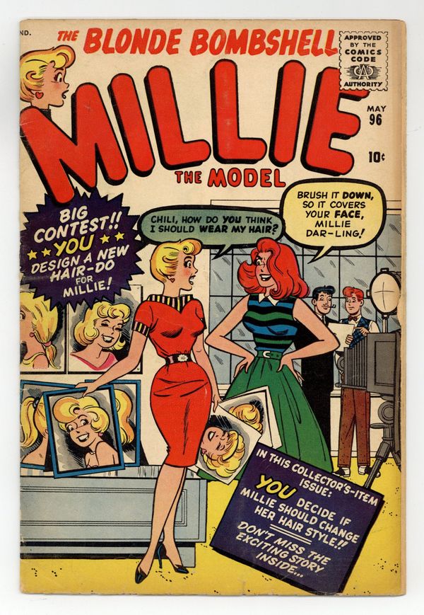 Cover art by Stan Goldberg. Office Beauty Contest, Popping the Question, Hair Today Gone Tomorrow, and Not a Cent for the Rent! starring Millie the Model. Untitled stories featuring Millie and Chili Dilly. Hanover and His Honeys! Millie Models activity page. Millie's Fashion Cut-Outs. You Design the Outfits. You Can Draw Millie! Stories by Stan Lee, art by Stan Goldberg. 36 pgs. $0.10. Cover price $0.10.
