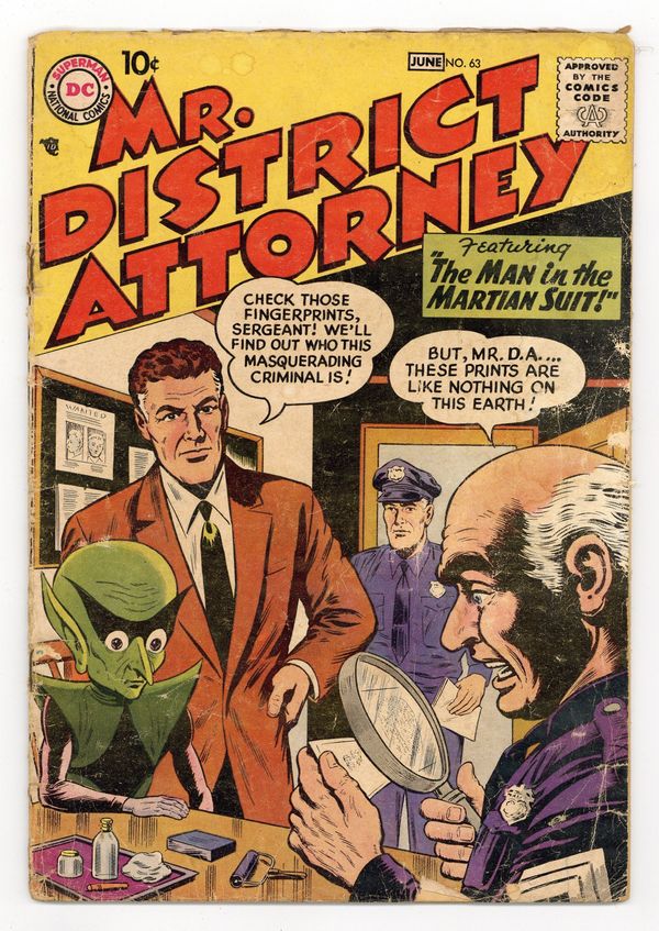 Cover by Sheldon Moldoff and Ray Burnley. Stories by Henry Boltinoff and unknown. Art by Sheldon Moldoff, Ray Burnley and Henry Boltinoff. Mr. District Attorney in: "The Flying Prison" with art by Sheldon Moldoff and Ray Burnley; "Million Dollar Ticket" with art by Moldoff and Burnley; and "The Man in the Martian Suit" with art by Moldoff and Burnley. Also in this issue: Warden Willis 2-pager by Henry Boltinoff; The D.A. File 1-page text article; Casey the Cop 1-pager by Boltinoff, reprinted from Batman (1940) #64; and Casey the Cop 1-pager by Boltinoff, reprinted from Superboy (1949-1979 1st Series DC) #20. 32 pages, full color. Cover price $0.10.