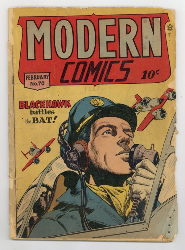 Cover art by Reed Crandall. Blackhawk Battles the Bat starring Blackhawk, pencils by Crandall, inks by Chuck Cuidera. Untitled stories starring Torchy (script and art by Bill Ward), Dogtag (script and art by Bart Tumey), Will Bragg (script and art by Paul Gustavson), Ezra (script and art by Harry Sahle), and Choo Choo (script and art by Gill Fox). The Slavers text story starring Blackhawk. 52 pgs. $0.10. Cover price $0.10.