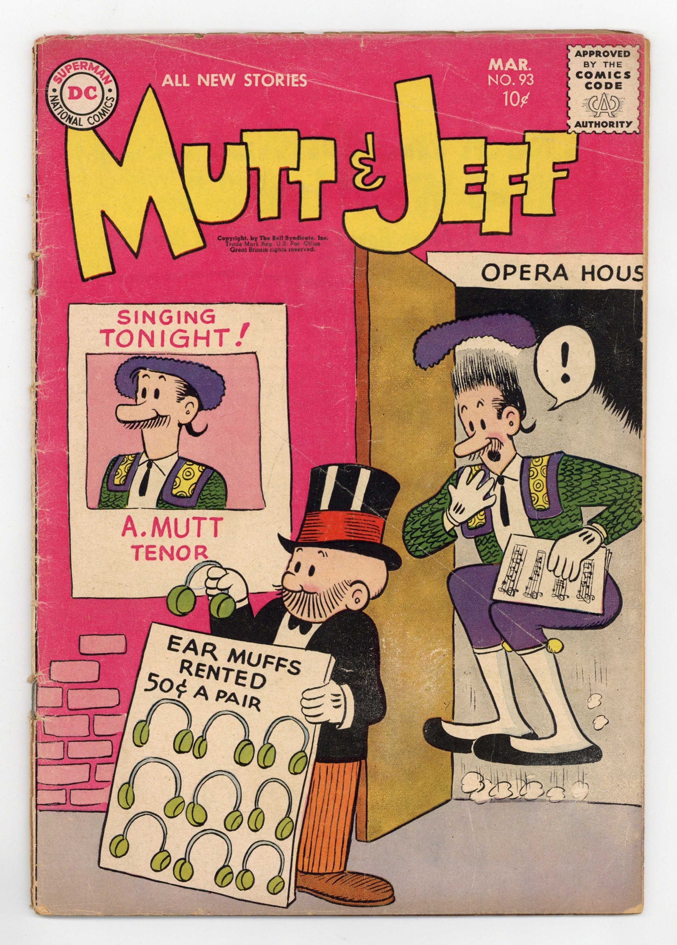 Cover by Sheldon Mayer (credited as Bud Fisher). Stories and art by Al Smith (credited as Bud Fisher), Jack Schiff and Ruben Moreira. DC reprints the comic strip that defined the comic strip, featuring the original tall-and-short comedy duo. Also featuring the "topper" strip Cicero's Cat. Jeff goes to the North Pole and faces a polar bear. Mutt tells off a bully. Mutt and Jeff go bowling. Plus a PSA about Brotherhood Week and a vintage ad for Silly Putty knock-off Nutty Putty. Mutt & Jeff; Cicero's Cat; Hollywood Ha-Lights; Platter Data; Buzzy's Special Brotherhood Week Quiz. 32 pages, Full Color. Cover price $0.10.