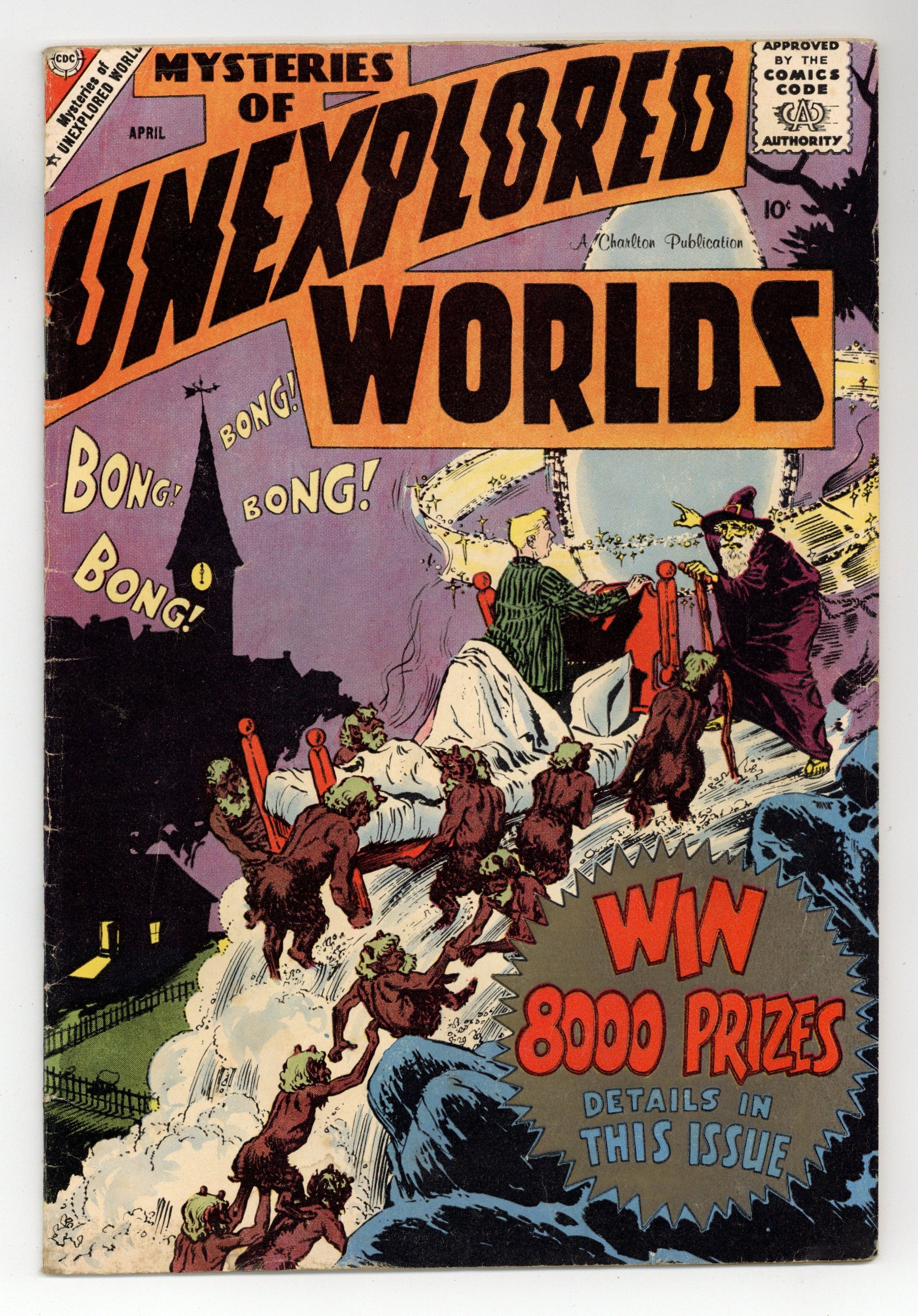 Cover by Steve Ditko. Stories and art by Steve Ditko, Matt Baker, Vince Colletta, Charles Nicholas, Vince Alascia, and Ernie Hart. Charlton's popular series features tales of science fiction and fantasy with twist endings. A run-down house cheers up a distraught couple, and vice versa, in a story with art by Spider-Man co-creator Steve Ditko. In another Ditko story that reflects its Cold War origins, deadly machines produce the weapons of war in a future world that doesn't need them. Lou gets Flo a magical charm bracelet from one of those magical sidewalk vendors, but it only does good if your intentions are good, in a story with art by good-girl art legend Matt Baker. The Water Stealers; Automata Ultima; The House That Cheered Up; A Lost Dimension; The Charm Bracelet. 32 pages, Full Color. Cover price $0.10.