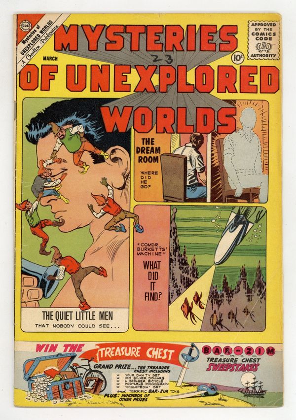 Cover by Steve Ditko. Stories and art by Steve Ditko, Rocco "Rocke" Mastroserio, Vince Alascia and Bill Molno. Charlton's popular series features tales of science fiction and fantasy with twist endings. After a nervous breakdown, Clayton can see mischievous little men that no one else can see, in a story with art by Spider-Man co-creator Steve Ditko. A scientist's experiments in "accelerated evolution" result in chimps who like Hawaiian shirts, cigars and sunglasses. Nondescript janitor Nikolas finds a portal to another dimension, where he is revered as "The Wise One." The Quiet Little Men; The Unusual Tails; Spy From Saturnia; The Dream Room; Commander Burkett's Machine. 32 pages, Full Color. Cover price $0.10.