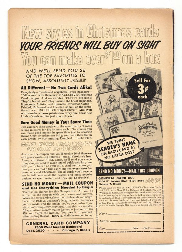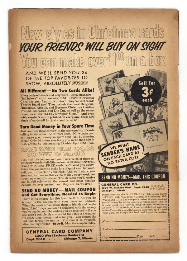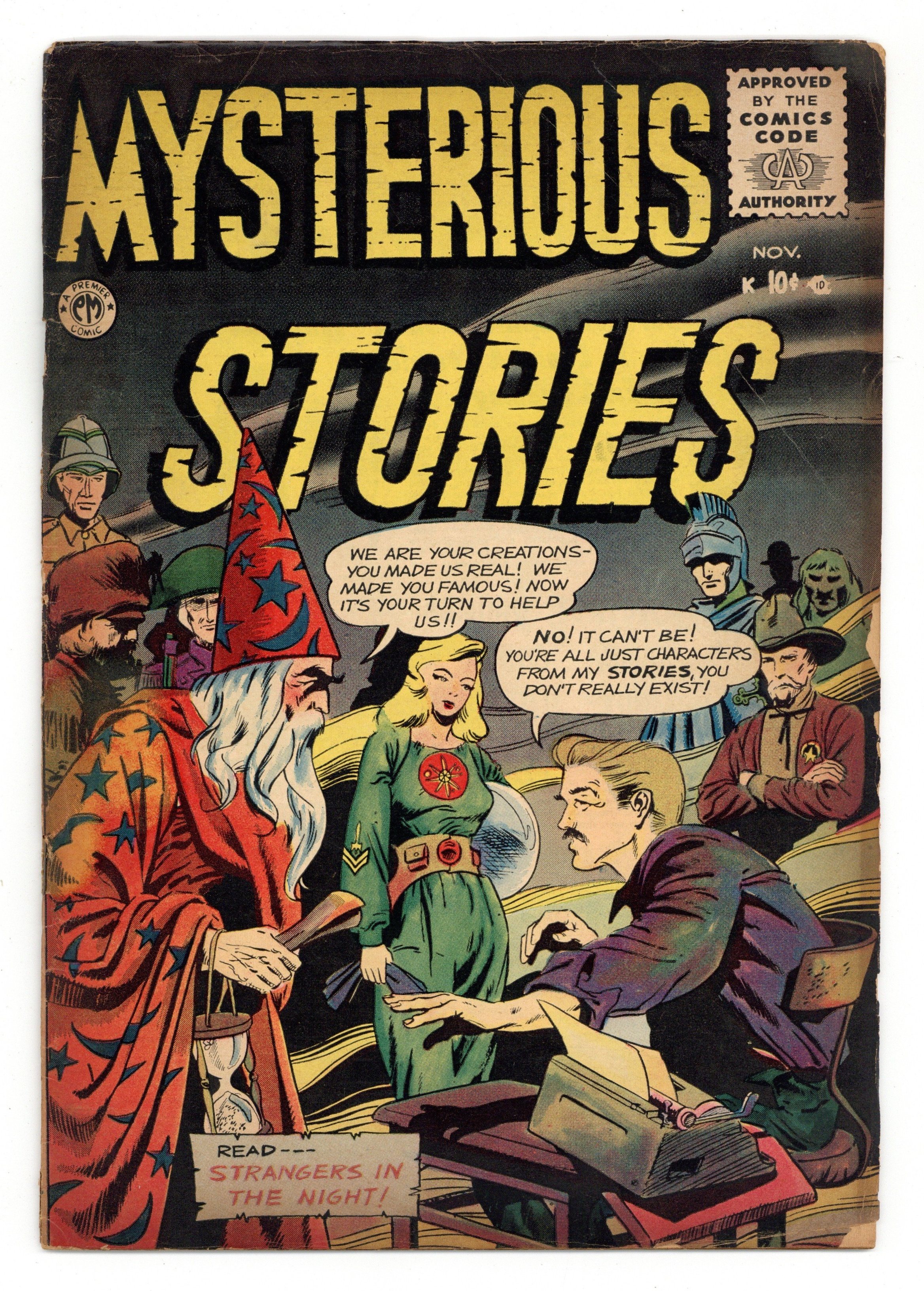 "Strangers in the Night"; Comic book artist Dan Wallace is confronted by the characters of the story he is drawing; They demand a happy ending instead of being kidnapped into outer space by Martians. "Grow a Crooked House" text story. "The Secret of the Sewer!"; The kind sewer worker Harvey Thomas finds a magic purse producing endless money; He indulges in a life of luxury and becomes a bitter and cruel man. "A Dog's Best Friend"; Satin, a seeing-eye dog, watches over blind Beth. In the course of the years, they each save the other's life. "Mystery of Forlorn Island" text story. "Goldy Lox and the Three Bears," art by Hy Fleishman; Goldy Lox, a traveling saleswoman, breaks into the house of the three bears; She uses her magic do-it-yourself-kits to transform them into humans, but ends up being a bear herself. 36 pgs., full color. Cover price $0.10.