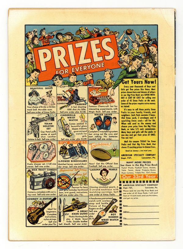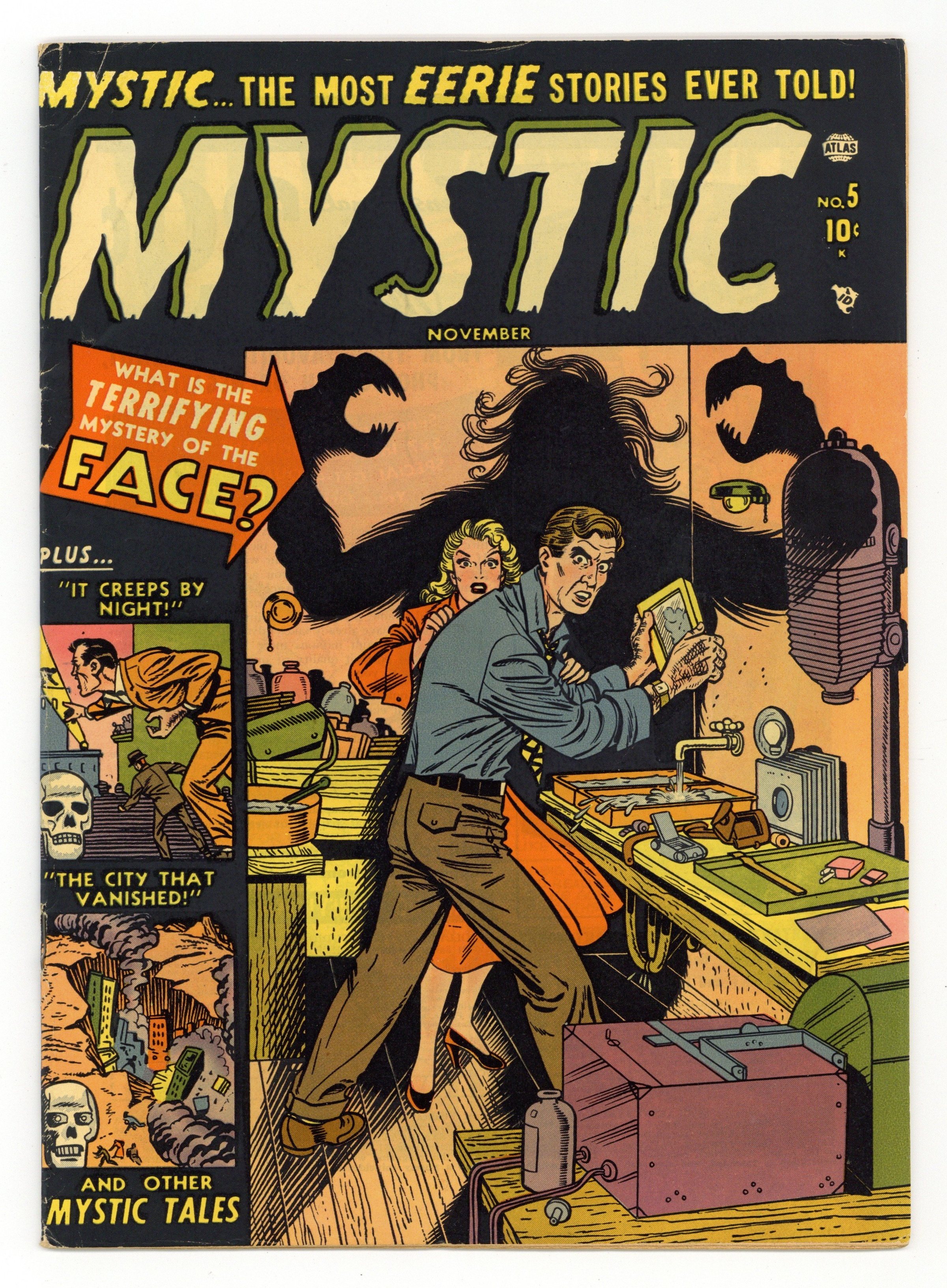 The City That Vanished; After entire cities are pulled into space by giant magnets placed on a hostile planet the Earth people load up a city with atomic and hydrogen bombs to be pulled to its target. The Valley of the Vampires text story. It Creeps By Night!; A man with an intense fear of cats concludes suicide may help him reincarnate into a body without a fear of cats. He reincarnates into a mouse. The Face in the Picture; A photographer with a wife who doesn't want to be photographed is neighbors with a hideous monster who appears as a human woman to the senses but is revealed as it really is in photographs. Trapped!; A man who views space time as a hobby meets up with another man who works as a space time researcher and gets himself caught and shrunk into a small box. 36 pgs. $0.10. Cover price $0.10.